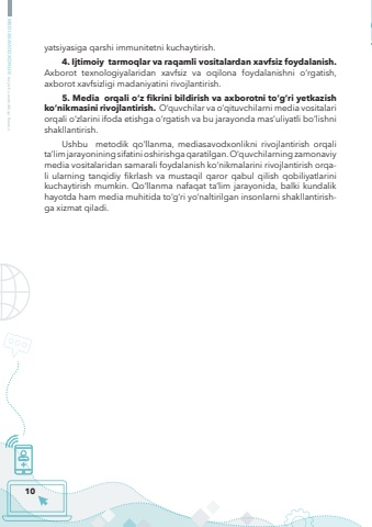 10MEDIASAVODXONLIK bo%u2018yicha metodik qo%u2018llanmayatsiyasiga qarshi immunitetni kuchaytirish. 4. Ijtimoiy tarmoqlar va raqamli vositalardan xavfsiz foydalanish. Axborot texnologiyalaridan xavfsiz va oqilona foydalanishni o%u2018rgatish, axborot xavfsizligi madaniyatini rivojlantirish. 5. Media orqali o%u2018z fikrini bildirish va axborotni to%u2018g%u2018ri yetkazish ko%u2018nikmasini rivojlantirish. O%u2018quvchilar va o%u2018qituvchilarni media vositalari orqali o%u2018zlarini ifoda etishga o%u2018rgatish va bu jarayonda mas%u2019uliyatli bo%u2018lishni shakllantirish.Ushbu metodik qo%u2018llanma, mediasavodxonlikni rivojlantirish orqali ta%u2019lim jarayonining sifatini oshirishga qaratilgan. O%u2018quvchilarning zamonaviy media vositalaridan samarali foydalanish ko%u2018nikmalarini rivojlantirish orqali ularning tanqidiy fikrlash va mustaqil qaror qabul qilish qobiliyatlarini kuchaytirish mumkin. Qo%u2018llanma nafaqat ta%u2019lim jarayonida, balki kundalik hayotda ham media muhitida to%u2018g%u2018ri yo%u2018naltirilgan insonlarni shakllantirishga xizmat qiladi.