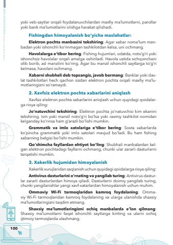 100MEDIASAVODXONLIK bo%u2018yicha metodik qo%u2018llanmayoki veb-saytlar orqali foydalanuvchilardan maxfiy ma%u2019lumotlarni, parollar yoki bank ma%u2019lumotlarini olishga harakat qilishadi.Fishingdan himoyalanish bo%u2018yicha maslahatlar:Elektron pochta manbasini tekshiring: Agar xabar noma%u2019lum manbadan yoki ishonchli ko%u2018rinmagan tashkilotdan kelsa, uni ochmang.Havolalarga e%u2019tibor bering: Fishing hujumlari, odatda, noto%u2018g%u2018ri yoki ishonchsiz havolalar orqali amalga oshiriladi. Havola ustida sichqonchani olib borib, asl manzilini ko%u2018ring. Agar bu manzil ishonchli saytlarga to%u2018g%u2018ri kelmasa, havolani ochmang.Xabarni shubhali deb topsangiz, javob bermang: Banklar yoki davlat tashkilotlari hech qachon sizdan elektron pochta orqali maxfiy ma%u2019lumotlaringizni so%u2018ramaydi.2. Xavfsiz elektron pochta xabarlarini aniqlashXavfsiz elektron pochta xabarlarini aniqlash uchun quyidagi qoidalarga rioya qiling:Jo%u2018natuvchini tekshiring: Elektron pochta jo%u2018natuvchisi kim ekanini tekshiring. Ism yoki manzil noto%u2018g%u2018ri bo%u2018lsa yoki rasmiy tashkilot nomidan kelganday ko%u2018rinsa ham g%u2018arazli bo%u2018lishi mumkin.Grammatik va imlo xatolariga e%u2019tibor bering: Soxta xabarlarda ko%u2018pincha grammatik yoki imlo xatolari mavjud bo%u2018ladi. Bu ham fishing xabarning belgisi bo%u2018lishi mumkin.Qo%u2018shimcha fayllardan ehtiyot bo%u2018ling: Shubhali manbalardan kelgan elektron pochtadagi fayllarni ochmang, chunki ular zararli dasturlarni tarqatishi mumkin.3. Xakerlik hujumidan himoyalanishXakerlik xurujlaridan saqlanish uchun quyidagi qoidalarga rioya qiling:Antivirus dasturlarini o%u2018rnating va yangilab turing: Antivirus dasturlar zararli dasturlardan himoya qiladi. Dasturlarni doimiy yangilab turing, chunki yangilanishlar yangi xavf-xatarlardan himoyalanish uchun muhim.Ommaviy Wi-Fi tarmoqlaridan kamroq foydalaning: Ommaviy Wi-Fi tarmoqlaridan kamroq foydalaning va ularga ulanishda shaxsiy ma%u2019lumotlaringizni taqdim etmang.Shaxsiy ma%u2019lumotlaringizni ochiq manbalarda e%u2019lon qilmang: Shaxsiy ma%u2019lumotlarni faqat ishonchli saytlarga kiriting va ularni ochiq ijtimoiy tarmoqlarda ulashmang.