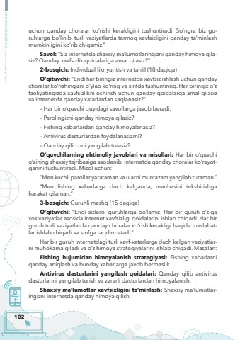 102MEDIASAVODXONLIK bo%u2018yicha metodik qo%u2018llanmauchun qanday choralar ko%u2018rishi kerakligini tushuntiradi. So%u2018ngra biz guruhlarga bo%u2018linib, turli vaziyatlarda tarmoq xavfsizligini qanday ta%u2019minlash mumkinligini ko%u2018rib chiqamiz.%u201dSavol: %u201cSiz internetda shaxsiy ma%u2019lumotlaringizni qanday himoya qilasiz? Qanday xavfsizlik qoidalariga amal qilasiz?%u201d2-bosqich: Individual fikr yuritish va tahlil (10 daqiqa)O%u2018qituvchi: %u201cEndi har biringiz internetda xavfsiz ishlash uchun qanday choralar ko%u2018rishingizni o%u2018ylab ko%u2018ring va sinfda tushuntiring. Har biringiz o%u2018z faoliyatingizda xavfsizlikni oshirish uchun qanday qoidalarga amal qilasiz va internetda qanday xatarlardan saqlanasiz?%u201d%u2013 Har bir o%u2018quvchi quyidagi savollarga javob beradi:%u2013 Parolingizni qanday himoya qilasiz?%u2013 Fishing xabarlardan qanday himoyalanasiz?%u2013 Antivirus dasturlardan foydalanasizmi? %u2013 Qanday qilib uni yangilab turasiz?O%u2018quvchilarning ehtimoliy javoblari va misollari: Har bir o%u2018quvchi o%u2018zining shaxsiy tajribasiga asoslanib, internetda qanday choralar ko%u2018rayotganini tushuntiradi. Misol uchun:%u201cMen kuchli parollar yarataman va ularni muntazam yangilab turaman.%u201d%u201cMen fishing xabarlarga duch kelganda, manbasini tekshirishga harakat qilaman.%u201d3-bosqich: Guruhli mashq (15 daqiqa)O%u2018qituvchi: %u201cEndi sizlarni guruhlarga bo%u2018lamiz. Har bir guruh o%u2018ziga xos vaziyatlar asosida internet xavfsizligi qoidalarini ishlab chiqadi. Har bir guruh turli vaziyatlarda qanday choralar ko%u2018rish kerakligi haqida maslahatlar ishlab chiqadi va sinfga taqdim etadi.%u201dHar bir guruh internetdagi turli xavf-xatarlarga duch kelgan vaziyatlarni muhokama qiladi va o%u2018z himoya strategiyalarini ishlab chiqadi. Masalan:Fishing hujumidan himoyalanish strategiyasi: Fishing xabarlarni qanday aniqlash va bunday xabarlarga javob bermaslik.Antivirus dasturlarini yangilash qoidalari: Qanday qilib antivirus dasturlarini yangilab turish va zararli dasturlardan himoyalanish.Shaxsiy ma%u2019lumotlar xavfsizligini ta%u2019minlash: Shaxsiy ma%u2019lumotlaringizni internetda qanday himoya qilish.