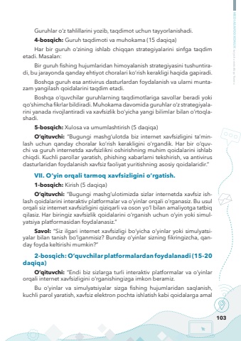 103MEDIASAVODXONLIK bo%u2018yicha metodik qo%u2018llanmaGuruhlar o%u2018z tahlillarini yozib, taqdimot uchun tayyorlanishadi.4-bosqich: Guruh taqdimoti va muhokama (15 daqiqa)Har bir guruh o%u2018zining ishlab chiqqan strategiyalarini sinfga taqdim etadi. Masalan:Bir guruh fishing hujumlaridan himoyalanish strategiyasini tushuntiradi, bu jarayonda qanday ehtiyot choralari ko%u2018rish kerakligi haqida gapiradi.Boshqa guruh esa antivirus dasturlardan foydalanish va ularni muntazam yangilash qoidalarini taqdim etadi.Boshqa o%u2018quvchilar guruhlarning taqdimotlariga savollar beradi yoki qo%u2018shimcha fikrlar bildiradi. Muhokama davomida guruhlar o%u2018z strategiyalarini yanada rivojlantiradi va xavfsizlik bo%u2018yicha yangi bilimlar bilan o%u2018rtoqlashadi.5-bosqich: Xulosa va umumlashtirish (5 daqiqa)O%u2018qituvchi: %u201cBugungi mashg%u2018ulotda biz internet xavfsizligini ta%u2019minlash uchun qanday choralar ko%u2018rish kerakligini o%u2018rgandik. Har bir o%u2018quvchi va guruh internetda xavfsizlikni oshirishning muhim qoidalarini ishlab chiqdi. Kuchli parollar yaratish, phishing xabarlarni tekshirish, va antivirus dasturlaridan foydalanish xavfsiz faoliyat yuritishning asosiy qoidalaridir.%u201dVII. O%u2018yin orqali tarmoq xavfsizligini o%u2018rgatish.1-bosqich: Kirish (5 daqiqa)O%u2018qituvchi: %u201cBugungi mashg%u2018ulotimizda sizlar internetda xavfsiz ishlash qoidalarini interaktiv platformalar va o%u2018yinlar orqali o%u2018rganasiz. Bu usul orqali siz internet xavfsizligini qiziqarli va oson yo%u2018l bilan amaliyotga tatbiq qilasiz. Har biringiz xavfsizlik qoidalarini o%u2018rganish uchun o%u2018yin yoki simulyatsiya platformasidan foydalanasiz.%u201dSavol: %u201cSiz ilgari internet xavfsizligi bo%u2018yicha o%u2018yinlar yoki simulyatsiyalar bilan tanish bo%u2018lganmisiz? Bunday o%u2018yinlar sizning fikringizcha, qanday foyda keltirishi mumkin?%u201d2-bosqich: O%u2018quvchilar platformalardan foydalanadi (15-20 daqiqa)O%u2018qituvchi: %u201cEndi biz sizlarga turli interaktiv platformalar va o%u2018yinlar orqali internet xavfsizligini o%u2018rganishingizga imkon beramiz. Bu o%u2018yinlar va simulyatsiyalar sizga fishing hujumlaridan saqlanish, kuchli parol yaratish, xavfsiz elektron pochta ishlatish kabi qoidalarga amal