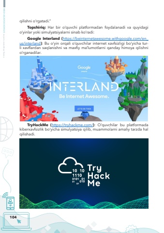 104MEDIASAVODXONLIK bo%u2018yicha metodik qo%u2018llanmaqilishni o%u2018rgatadi.%u201dTopshiriq: Har bir o%u2018quvchi platformadan foydalanadi va quyidagi o%u2018yinlar yoki simulyatsiyalarni sinab ko%u2018radi:Google Interland (https://beinternetawesome.withgoogle.com/en_us/interland): Bu o%u2018yin orqali o%u2018quvchilar internet xavfsizligi bo%u2018yicha turli xavflardan saqlanishni va maxfiy ma%u2019lumotlarni qanday himoya qilishni o%u2018rganadilar.TryHackMe (https://tryhackme.com/): O%u2018quvchilar bu platformada kiberxavfsizlik bo%u2018yicha simulyatsiya qilib, muammolarni amaliy tarzda hal qilishadi.