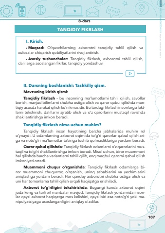 107MEDIASAVODXONLIK bo%u2018yicha metodik qo%u2018llanma8-darsTANQIDIY FIKRLASHI. Kirish.%u2022%u0009Maqsad: O%u2018quvchilarning axborotni tanqidiy tahlil qilish va xulosalar chiqarish qobiliyatlarini rivojlantirish.%u2022%u0009Asosiy tushunchalar: Tanqidiy fikrlash, axborotni tahlil qilish, dalillarga asoslangan fikrlar, tanqidiy yondashuv.II. Darsning boshlanishi: Tashkiliy qism.Mavzuning kirish qismi:Tanqidiy fikrlash %u2013 bu insonning ma%u2019lumotlarni tahlil qilish, savollar berish, mavjud bilimlarni shubha ostiga olish va qaror qabul qilishda mantiqiy asosda harakat qilish ko%u2018nikmasidir. Bu turdagi fikrlash insonlarga faktlarni tekshirish, dalillarni ajratib olish va o%u2018z qarorlarini mustaqil ravishda shakllantirishga imkon beradi.Tanqidiy fikrlash nima uchun muhim?Tanqidiy fikrlash inson hayotining barcha jabhalarida muhim rol o%u2018ynaydi. U odamlarning axborot oqimida to%u2018g%u2018ri qarorlar qabul qilishlariga va noto%u2018g%u2018ri ma%u2019lumotlar ta%u2019siriga tushib qolmasliklariga yordam beradi.Qaror qabul qilishda: Tanqidiy fikrlash odamlarni o%u2018z qarorlarini mustaqil va to%u2018g%u2018ri shakllantirishga imkon beradi. Misol uchun, biror muammoni hal qilishda barcha variantlarni tahlil qilib, eng maqbul qarorni qabul qilish imkoniyati ortadi.Muammoni chuqur o%u2018rganishda: Tanqidiy fikrlash odamlarga biror muammoni chuqurroq o%u2018rganish, uning sabablarini va yechimlarini aniqlashga yordam beradi. Har qanday axborotni shubha ostiga olish va uni har tomonlama tahlil qilish orqali haqiqatga erishiladi.Axborot to%u2018g%u2018riligini tekshirishda: Bugungi kunda axborot oqimi juda keng va turli xil manbalar mavjud. Tanqidiy fikrlash yordamida insonlar qaysi axborot haqiqatga mos kelishini, qaysi biri esa noto%u2018g%u2018ri yoki manipulyatsiyaga asoslanganligini aniqlay oladilar.