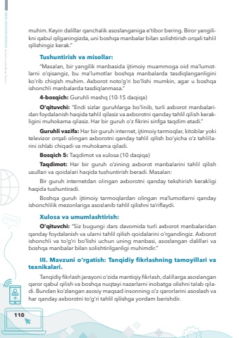 110MEDIASAVODXONLIK bo%u2018yicha metodik qo%u2018llanmamuhim. Keyin dalillar qanchalik asoslanganiga e%u2019tibor bering. Biror yangilikni qabul qilganingizda, uni boshqa manbalar bilan solishtirish orqali tahlil qilishingiz kerak.%u201dTushuntirish va misollar:%u201cMasalan, bir yangilik manbasida ijtimoiy muammoga oid ma%u2019lumotlarni o%u2018qisangiz, bu ma%u2019lumotlar boshqa manbalarda tasdiqlanganligini ko%u2018rib chiqish muhim. Axborot noto%u2018g%u2018ri bo%u2018lishi mumkin, agar u boshqa ishonchli manbalarda tasdiqlanmasa.%u201d4-bosqich: Guruhli mashq (10-15 daqiqa)O%u2018qituvchi: %u201cEndi sizlar guruhlarga bo%u2018linib, turli axborot manbalaridan foydalanish haqida tahlil qilasiz va axborotni qanday tahlil qilish kerakligini muhokama qilasiz. Har bir guruh o%u2018z fikrini sinfga taqdim etadi.%u201dGuruhli vazifa: Har bir guruh internet, ijtimoiy tarmoqlar, kitoblar yoki televizor orqali olingan axborotni qanday tahlil qilish bo%u2018yicha o%u2018z tahlillarini ishlab chiqadi va muhokama qiladi.Bosqich 5: Taqdimot va xulosa (10 daqiqa)Taqdimot: Har bir guruh o%u2018zining axborot manbalarini tahlil qilish usullari va qoidalari haqida tushuntirish beradi. Masalan:Bir guruh internetdan olingan axborotni qanday tekshirish kerakligi haqida tushuntiradi.Boshqa guruh ijtimoiy tarmoqlardan olingan ma%u2019lumotlarni qanday ishonchlilik mezonlariga asoslanib tahlil qilishni ta%u2019riflaydi.Xulosa va umumlashtirish:O%u2018qituvchi: %u201cSiz bugungi dars davomida turli axborot manbalaridan qanday foydalanish va ularni tahlil qilish qoidalarini o%u2018rgandingiz. Axborot ishonchli va to%u2018g%u2018ri bo%u2018lishi uchun uning manbasi, asoslangan dalillari va boshqa manbalar bilan solishtirilganligi muhimdir.%u201dIII. Mavzuni o%u2018rgatish: Tanqidiy fikrlashning tamoyillari va texnikalari.Tanqidiy fikrlash jarayoni o%u2018zida mantiqiy fikrlash, dalillarga asoslangan qaror qabul qilish va boshqa nuqtayi nazarlarni inobatga olishni talab qiladi. Bundan ko%u2018zlangan asosiy maqsad insonning o%u2018z qarorlarini asoslash va har qanday axborotni to%u2018g%u2018ri tahlil qilishga yordam berishdir.