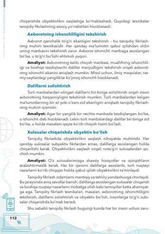 112MEDIASAVODXONLIK bo%u2018yicha metodik qo%u2018llanmachiqarishda obyektivlikni saqlashga ko%u2018maklashadi. Quyidagi texnikalar tanqidiy fikrlashning asosiy yo%u2018nalishlari hisoblanadi:Axborotning ishonchliligini tekshirishAxborot qanchalik to%u2018g%u2018ri ekanligini tekshirish %u2013 bu tanqidiy fikrlashning muhim texnikasidir. Har qanday ma%u2019lumotni qabul qilishdan oldin uning manbasini tekshirish zarur. Axborot ishonchli manbaga asoslangan bo%u2018lsa, u to%u2018g%u2018ri bo%u2018lishi ehtimoli yuqori.Amaliyot: Axborotning kelib chiqish manbasi, muallifning ishonchliligi va boshqa tasdiqlovchi dalillar mavjudligini tekshirish orqali axborotning ishonchli ekanini aniqlash mumkin. Misol uchun, ilmiy maqolalar, rasmiy saytlardagi yangiliklar ko%u2018proq ishonchli hisoblanadi.Dalillarni solishtirishTurli manbalardan olingan dalillarni bir-biriga solishtirish orqali inson axborotning haqqoniyligini tekshirish mumkin. Turli manbalardan kelgan ma%u2019lumotlarning bir xil yoki o%u2018zaro zid ekanligini aniqlash tanqidiy fikrlashning muhim qismidir.Amaliyot: Agar bir yangilik bir nechta manbada tasdiqlangan bo%u2018lsa, u ishonchli deb hisoblanadi. Lekin turli manbalardagi dalillar bir-biriga zid bo%u2018lsa, u holda masalani qayta ko%u2018rib chiqish lozim bo%u2018ladi.Xulosalar chiqarishda obyektiv bo%u2018lishTanqidiy fikrlashda obyektivlikni saqlash nihoyatda muhimdir. Har qanday xulosalar subyektiv fikrlardan emas, dalillarga asoslangan holda chiqarilishi kerak. Obyektivlikni saqlash orqali noto%u2018g%u2018ri xulosalardan qochish mumkin.Amaliyot: O%u2018z xulosalarimizga shaxsiy hissiyotlar va qiziqishlarni aralashtirmaslik kerak. Har bir qarorni dalillarga asoslanib, turli nuqtayi nazarlarni ko%u2018rib chiqqan holda qabul qilish obyektivlikni ta%u2019minlaydi.Tanqidiy fikrlash odamlarni mantiqiy va tahliliy yondashuvga chorlaydi. Bu jarayonda aniq savollar berish, dalillarga asoslangan xulosalar chiqarish va boshqa nuqtayi nazarlarni inobatga olish kabi tamoyillar katta ahamiyatga ega. Tanqidiy fikrlash texnikalari, masalan, axborotning ishonchliligini tekshirish, dalillarni solishtirish va obyektiv bo%u2018lish, insonlarga to%u2018g%u2018ri xulosalar chiqarishda ko%u2018mak beradi. Shu sababli tanqidiy fikrlash bugungi kunda har bir inson uchun zaru