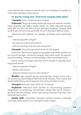 113MEDIASAVODXONLIK bo%u2018yicha metodik qo%u2018llanmariy ko%u2018nikma bo%u2018lib, u axborot oqimida to%u2018g%u2018ri yo%u2018l topishga va mustaqil qarorlar qabul qilishga yordam beradi.IV. Amaliy mashg%u2018ulot: %u201cAxborotni tanqidiy tahlil qilish%u201d.1-bosqich: Kirish va tushuntirish (5 daqiqa)O%u2018qituvchi: %u201cBugungi mashg%u2018ulotimizda sizga turli axborot manbalaridan yangiliklar yoki faktlar taqdim etiladi. Siz ushbu axborotni tanqidiy tahlil qilib, uni ishonchli yoki noto%u2018g%u2018ri ekanligini aniqlaysiz. Tanqidiy tahlil qilish orqali ma%u2019lumotning qanchalik ishonchli ekanligini baholay olasiz.%u201d%u201cAxborotni tahlil qilishda siz quyidagi savollarga javob berishingiz kerak:%u2013 Axborot qayerdan olingan?%u2013 Bu axborot manbasi ishonchlimi?%u2013 Axborot mantiqan to%u2018g%u2018rimi yoki noto%u2018g%u2018rimi?%u201d2-bosqich: O%u2018quvchilarga axborotni berish (10 daqiqa)O%u2018qituvchi: %u201cEndi har biringizga turli yangiliklar yoki faktlar beriladi. Har bir o%u2018quvchi berilgan ma%u2019lumotni tanqidiy tahlil qilishi kerak. Siz axborotning ishonchliligi, manbasi va mantiqiyligiga e%u2019tibor berishingiz kerak.%u201dHar bir o%u2018quvchi berilgan axborotni ko%u2018rib chiqadi va quyidagi savollarga javob beradi:%u2013 Axborot qayerdan olingan?%u2013 Manba ishonchlimi?%u2013 Axborot mantiqan to%u2018g%u2018rimi yoki noto%u2018g%u2018ri?Misollar: Agar yangilik ijtimoiy tarmoqlardan olingan bo%u2018lsa, o%u2018quvchi manbaning ishonchliligini tekshirishi kerak. Masalan, ilmiy maqola yoki davlat tashkilotining rasmiy bayonoti ishonchliroq bo%u2018lishi mumkin.3-bosqich: Axborotni tahlil qilish (10-15 daqiqa)O%u2018qituvchi: %u201cAxborotni tahlil qilishda siz ma%u2019lumotning qayerdan olinganligini va manbaning ishonchliligini diqqat bilan ko%u2018rib chiqishingiz kerak. Bundan tashqari, ushbu axborotning mantiqan to%u2018g%u2018riligini ham baholashingiz muhim.%u201dAmaliy tahlil: O%u2018quvchilar tanlangan axborot bo%u2018yicha yuqoridagi savollarga javob beradi va o%u2018z xulosalarini yozib chiqadi.