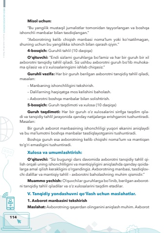 114MEDIASAVODXONLIK bo%u2018yicha metodik qo%u2018llanmaMisol uchun:%u201cBu yangilik mustaqil jurnalistlar tomonidan tayyorlangan va boshqa ishonchli manbalar bilan tasdiqlangan.%u201d%u201cAxborotning kelib chiqish manbasi noma%u2019lum yoki ko%u2018rsatilmagan, shuning uchun bu yangilikka ishonch bilan qarash qiyin.%u201d4-bosqich: Guruhli tahlil (10 daqiqa)O%u2018qituvchi: %u201cEndi sizlarni guruhlarga bo%u2018lamiz va har bir guruh bir xil axborotni tanqidiy tahlil qiladi. Siz ushbu axborotni guruh bo%u2018lib muhokama qilasiz va o%u2018z xulosalaringizni ishlab chiqasiz.%u201dGuruhli vazifa: Har bir guruh berilgan axborotni tanqidiy tahlil qiladi, masalan:%u2013 Manbaning ishonchliligini tekshirish.%u2013 Dalillarning haqiqatga mos kelishini baholash.%u2013 Axborotni boshqa manbalar bilan solishtirish.5-bosqich: Guruh taqdimoti va xulosa (10 daqiqa)Guruh taqdimoti: Har bir guruh o%u2018z xulosalarini sinfga taqdim qiladi va tanqidiy tahlil jarayonida qanday natijalarga erishganini tushuntiradi. Masalan:Bir guruh axborot manbasining ishonchliligi yuqori ekanini aniqlaydi va bu ma%u2019lumotni boshqa manbalar tasdiqlayotganini tushuntiradi.Boshqa guruh esa axborotning kelib chiqishi noma%u2019lum va mantiqan to%u2018g%u2018ri emasligini tushuntiradi.Xulosa va umumlashtirish:O%u2018qituvchi: %u201cSiz bugungi dars davomida axborotni tanqidiy tahlil qilish orqali uning ishonchliligini va mantiqiyligini aniqlashda qanday qoidalarga amal qilish kerakligini o%u2018rgandingiz. Axborotning manbasi, tasdiqlovchi dalillar va mantiqiy tahlil %u2013 axborotni baholashning muhim qismidir.%u201dMuammo yechish: O%u2018quvchilar guruhlarga bo%u2018linib, berilgan axborotni tanqidiy tahlil qiladilar va o%u2018z xulosalarini taqdim etadilar.V. Tanqidiy yondashuvni qo%u2018llash uchun maslahatlar.1. Axborot manbasini tekshirishMaslahat: Axborotning qayerdan olinganini aniqlash muhim. Axborot