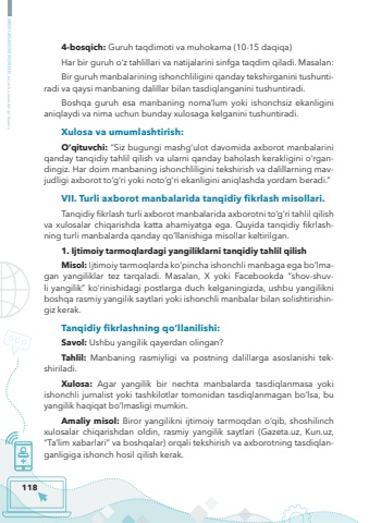 118MEDIASAVODXONLIK bo%u2018yicha metodik qo%u2018llanma4-bosqich: Guruh taqdimoti va muhokama (10-15 daqiqa)Har bir guruh o%u2018z tahlillari va natijalarini sinfga taqdim qiladi. Masalan:Bir guruh manbalarining ishonchliligini qanday tekshirganini tushuntiradi va qaysi manbaning dalillar bilan tasdiqlanganini tushuntiradi.Boshqa guruh esa manbaning noma%u2019lum yoki ishonchsiz ekanligini aniqlaydi va nima uchun bunday xulosaga kelganini tushuntiradi.Xulosa va umumlashtirish:O%u2018qituvchi: %u201cSiz bugungi mashg%u2018ulot davomida axborot manbalarini qanday tanqidiy tahlil qilish va ularni qanday baholash kerakligini o%u2018rgandingiz. Har doim manbaning ishonchliligini tekshirish va dalillarning mavjudligi axborot to%u2018g%u2018ri yoki noto%u2018g%u2018ri ekanligini aniqlashda yordam beradi.%u201dVII. Turli axborot manbalarida tanqidiy fikrlash misollari.Tanqidiy fikrlash turli axborot manbalarida axborotni to%u2018g%u2018ri tahlil qilish va xulosalar chiqarishda katta ahamiyatga ega. Quyida tanqidiy fikrlashning turli manbalarda qanday qo%u2018llanishiga misollar keltirilgan.1. Ijtimoiy tarmoqlardagi yangiliklarni tanqidiy tahlil qilishMisol: Ijtimoiy tarmoqlarda ko%u2018pincha ishonchli manbaga ega bo%u2018lmagan yangiliklar tez tarqaladi. Masalan, X yoki Facebookda %u201cshov-shuvli yangilik%u201d ko%u2018rinishidagi postlarga duch kelganingizda, ushbu yangilikni boshqa rasmiy yangilik saytlari yoki ishonchli manbalar bilan solishtirishingiz kerak.Tanqidiy fikrlashning qo%u2018llanilishi:Savol: Ushbu yangilik qayerdan olingan?Tahlil: Manbaning rasmiyligi va postning dalillarga asoslanishi tekshiriladi.Xulosa: Agar yangilik bir nechta manbalarda tasdiqlanmasa yoki ishonchli jurnalist yoki tashkilotlar tomonidan tasdiqlanmagan bo%u2018lsa, bu yangilik haqiqat bo%u2018lmasligi mumkin.Amaliy misol: Biror yangilikni ijtimoiy tarmoqdan o%u2018qib, shoshilinch xulosalar chiqarishdan oldin, rasmiy yangilik saytlari (Gazeta.uz, Kun.uz, %u201cTa%u2019lim xabarlari%u201d va boshqalar) orqali tekshirish va axborotning tasdiqlanganligiga ishonch hosil qilish kerak.