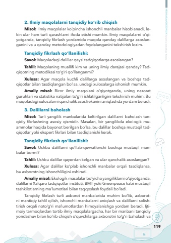 119MEDIASAVODXONLIK bo%u2018yicha metodik qo%u2018llanma2. Ilmiy maqolalarni tanqidiy ko%u2018rib chiqishMisol: Ilmiy maqolalar ko%u2018pincha ishonchli manbalar hisoblanadi, lekin ular ham turli qarashlarni ifoda etishi mumkin. Ilmiy maqolalarni o%u2018qiyotganda, tanqidiy fikrlash yordamida maqola qanday dalillarga asoslanganini va u qanday metodologiyadan foydalanganini tekshirish lozim.Tanqidiy fikrlash qo%u2018llanilishi:Savol: Maqoladagi dalillar qaysi tadqiqotlarga asoslangan?Tahlil: Maqolaning muallifi kim va uning ilmiy darajasi qanday? Tadqiqotning metodikasi to%u2018g%u2018ri qo%u2018llanganmi?Xulosa: Agar maqola kuchli dalillarga asoslangan va boshqa tadqiqotlar bilan tasdiqlangan bo%u2018lsa, undagi xulosalarga ishonish mumkin.Amaliy misol: Biror ilmiy maqolani o%u2018qiyotganda, uning nazorat guruhlari va statistika natijalari to%u2018g%u2018ri ishlatilganligini tekshirish muhim. Bu maqoladagi xulosalarni qanchalik asosli ekanini aniqlashda yordam beradi.3. Dalillarni baholashMisol: Turli yangilik manbalarida keltirilgan dalillarni baholash tanqidiy fikrlashning asosiy qismidir. Masalan, bir yangilikda ekologik muammolar haqida bayonot berilgan bo%u2018lsa, bu dalillar boshqa mustaqil tadqiqotlar yoki ekspert fikrlari bilan tasdiqlanishi kerak.Tanqidiy fikrlash qo%u2018llanilishi:Savol: Ushbu dalillarni qo%u2018llab-quvvatlovchi boshqa mustaqil manbalar bormi?Tahlil: Ushbu dalillar qayerdan kelgan va ular qanchalik asoslangan?Xulosa: Agar dalillar ko%u2018plab ishonchli manbalar orqali tasdiqlansa, bu axborotning ishonchliligini oshiradi.Amaliy misol: Ekologik masalalar bo%u2018yicha yangiliklarni o%u2018qiyotganda, dalillarni Xalqaro tadqiqotlar instituti, BMT yoki Greenpeace kabi mustaqil tashkilotlarning ma%u2019lumotlari bilan taqqoslash foydali bo%u2018ladi.Tanqidiy fikrlash turli axborot manbalarida muhim bo%u2018lib, axborotni mantiqiy tahlil qilish, ishonchli manbalarni aniqlash va dalillarni solishtirish orqali noto%u2018g%u2018ri ma%u2019lumotlardan himoyalanishga yordam beradi. Ijtimoiy tarmoqlardan tortib ilmiy maqolalargacha, har bir manbani tanqidiy yondashuv bilan ko%u2018rib chiqish o%u2018quvchilarga axborotni to%u2018g%u2018ri baholash va