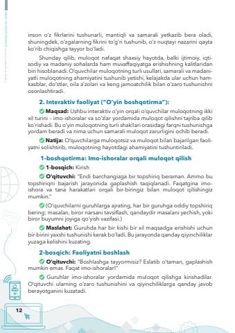 12MEDIASAVODXONLIK bo%u2018yicha metodik qo%u2018llanmainson o%u2018z fikrlarini tushunarli, mantiqli va samarali yetkazib bera oladi, shuningdek, o%u2018zgalarning fikrini to%u2018g%u2018ri tushunib, o%u2018z nuqtayi nazarini qayta ko%u2018rib chiqishga tayyor bo%u2018ladi.Shunday qilib, muloqot nafaqat shaxsiy hayotda, balki ijtimoiy, iqtisodiy va madaniy sohalarda ham muvaffaqiyatga erishishning kalitlaridan biri hisoblanadi. O%u2018quvchilar muloqotning turli usullari, samarali va madaniyatli muloqotning ahamiyatini tushunib yetishi, kelajakda ular uchun hamkasblar, do%u2018stlar, oila a%u2019zolari va keng jamoatchilik bilan o%u2018zaro tushunishni osonlashtiradi.2. Interaktiv faoliyat (%u201cO%u2018yin boshqotirma%u201d):%u2705Maqsad: Ushbu interaktiv o%u2018yin orqali o%u2018quvchilar muloqotning ikki xil turini %u2013 imo-ishoralar va so%u2018zlar yordamida muloqot qilishni tajriba qilib ko%u2018rishadi. Bu o%u2018yin muloqotning turli shakllari orasidagi farqni tushunishga yordam beradi va nima uchun samarali muloqot zarurligini ochib beradi.%u2705Natija: O%u2018quvchilarga muloqotsiz va muloqot bilan bajarilgan faoliyatni solishtirib, muloqotning hayotdagi ahamiyatini tushuntiriladi.1-boshqotirma: Imo-ishoralar orqali muloqot qilish%u27051-bosqich: Kirish%u2705O%u2018qituvchi: %u201cEndi barchangizga bir topshiriq beraman. Ammo bu topshiriqni bajarish jarayonida gaplashish taqiqlanadi. Faqatgina imoishora va tana harakatlari orqali bir-biringiz bilan muloqot qilishingiz mumkin.%u201d%u2705(O%u2018quvchilarni guruhlarga ajrating, har bir guruhga oddiy topshiriq bering: masalan, biror narsani tavsiflash, qandaydir masalani yechish, yoki biror buyumni joyiga qo%u2018yish vazifasi.)%u2705Maslahat: Guruhda har bir kishi bir xil maqsadga erishishi uchun bir-birini yaxshi tushunishi kerak bo%u2018ladi. Bu jarayonda qanday qiyinchiliklar yuzaga kelishini kuzating.2-bosqich: Faoliyatni boshlash%u2705O%u2018qituvchi: %u201cBoshlashga tayyormisiz? Eslatib o%u2018taman, gaplashish mumkin emas. Faqat imo-ishoralar!%u201d%u2705Guruhlar imo-ishoralar yordamida muloqot qilishga kirishadilar. O%u2018qituvchi ularning o%u2018zaro tushunishini va qiyinchiliklarga qanday javob berayotganini kuzatadi.