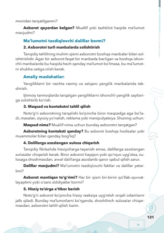 121MEDIASAVODXONLIK bo%u2018yicha metodik qo%u2018llanmamonidan tarqatilganmi?Axborot qayerdan kelgan? Muallif yoki tashkilot haqida ma%u2019lumot mavjudmi?Ma%u2019lumotni tasdiqlovchi dalillar bormi?2. Axborotni turli manbalarda solishtirishTanqidiy tahlilning muhim qismi axborotni boshqa manbalar bilan solishtirishdir. Agar bir axborot faqat bir manbada berilgan va boshqa ishonchli manbalarda bu haqida hech qanday ma%u2019lumot bo%u2018lmasa, bu ma%u2019lumotni shubha ostiga olish kerak.Amaliy maslahatlar:Yangiliklarni bir nechta rasmiy va xalqaro yangilik manbalarida tekshirish.Ijtimoiy tarmoqlarda tarqalgan yangiliklarni ishonchli yangilik saytlariga solishtirib ko%u2018rish.3. Maqsad va kontekstni tahlil qilishNoto%u2018g%u2018ri axborotning tarqalishi ko%u2018pincha biror maqsadga ega bo%u2018ladi, masalan, siyosiy yo%u2018nalish, reklama yoki manipulyatsiya. Shuning uchun:Maqsad nima? Muallif nima uchun bunday axborotni tarqatgan?Axborotning konteksti qanday? Bu axborot boshqa hodisalar yoki muammolar bilan qanday bog%u2018liq?4. Dalillarga asoslangan xulosa chiqarishTanqidiy fikrlashda hissiyotlarga tayanish emas, dalillarga asoslangan xulosalar chiqarish kerak. Biror axborot hayajon yoki qo%u2018rquv uyg%u2018otsa, xulosaga shoshmasdan, avval dalillarga asoslanib qaror qabul qilish zarur.Dalillar mavjudmi? Ma%u2019lumotni tasdiqlovchi faktlar va dalillar yetarlimi?Axborot mantiqan to%u2018g%u2018rimi? Har bir qism bir-birini qo%u2018llab-quvvatlayaptimi yoki o%u2018zaro ziddiyatlar bormi?5. Hissiy ta%u2019sirga e%u2019tibor berishNoto%u2018g%u2018ri axborot ko%u2018pincha hissiy reaksiya uyg%u2018otish orqali odamlarni jalb qiladi. Bunday ma%u2019lumotlarni ko%u2018rganda, shoshilinch xulosalar chiqarmasdan, axborotni tahlil qilish lozim.