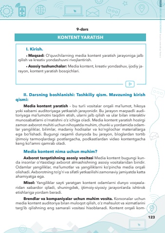123MEDIASAVODXONLIK bo%u2018yicha metodik qo%u2018llanma9-darsKONTENT YARATISHI. Kirish.%u2022%u0009Maqsad: O%u2018quvchilarning media kontent yaratish jarayoniga jalb qilish va kreativ yondashuvni rivojlantirish.%u2022%u0009Asosiy tushunchalar: Media kontent, kreativ yondashuv, ijodiy jarayon, kontent yaratish bosqichlari.II. Darsning boshlanishi: Tashkiliy qism. Mavzuning kirish qismi: Media kontent yaratish %u2013 bu turli vositalar orqali ma%u2019lumot, hikoya yoki xabarni auditoriyaga yetkazish jarayonidir. Bu jarayon maqsadli auditoriyaga ma%u2019lumotni taqdim etish, ularni jalb qilish va ular bilan interaktiv munosabatlarni o%u2018rnatishni o%u2018z ichiga oladi. Media kontent yaratish hozirgi zamon axborot muhiti uchun nihoyatda muhim, chunki u yordamida odamlar yangiliklar, bilimlar, madaniy hodisalar va ko%u2018ngilochar materiallarga ega bo%u2018lishadi. Bugungi raqamli dunyoda bu jarayon, bloglardan tortib ijtimoiy tarmoqlardagi postlargacha, podkastlardan video kontentgacha keng ko%u2018lamni qamrab oladi.Media kontent nima uchun muhim?Axborot tarqatishning asosiy vositasi Media kontent bugungi kunda insonlar o%u2018rtasidagi axborot almashishning asosiy vositalaridan biridir. Odamlar yangiliklar, ma%u2019lumotlar va yangiliklarni ko%u2018pincha media orqali olishadi. Axborotning to%u2018g%u2018ri va sifatli yetkazilishi zamonaviy jamiyatda katta ahamiyatga ega.Misol: Yangiliklar sayti yaratgan kontent odamlarni dunyo voqealaridan xabardor qiladi, shuningdek, ijtimoiy-siyosiy jarayonlarda ishtirok etishlariga yordam beradi.Brendlar va kompaniyalar uchun muhim vosita. Korxonalar uchun media kontent auditoriya bilan muloqot qilish, o%u2018z mahsulot va xizmatlarini targ%u2018ib qilishning eng samarali vositasi hisoblanadi. Kontent orqali kom