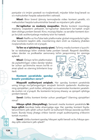 124MEDIASAVODXONLIK bo%u2018yicha metodik qo%u2018llanmapaniyalar o%u2018z imijini yaratadi va rivojlantiradi, mijozlar bilan bog%u2018lanadi va o%u2018z mahsulotlari haqida xabardorlikni oshiradi.Misol: Biror brend ijtimoiy tarmoqlarda video kontent yaratib, o%u2018z mahsulotlari haqida tushuntirishlar beradi va mijozlarni jalb qiladi.Ko%u2018ngilochar va madaniy maqsadlar. Media kontent insonlarga madaniy voqealarni yetkazish, ko%u2018ngilochar dasturlarni ko%u2018rsatish orqali dam olishga yordam beradi. Kino, musiqiy kliplar, va seriallar kontenti dunyo bo%u2018ylab auditoriyalarga madaniy ta%u2019sir ko%u2018rsatadi.Misol: Netflix va YouTube kabi platformalar global miqyosda ko%u2018ngilochar kontentni taqdim etib, insonlarning dam olish va madaniy jihatdan rivojlanishida muhim rol o%u2018ynaydi.Ta%u2019lim va o%u2018qitishning asosiy qismi. Ta%u2019limiy media kontent o%u2018quvchilar va talabalarga bilim olishda katta yordam beradi. Raqamli darsliklar, video darslar va podkastlar zamonaviy ta%u2019lim jarayonining bir qismiga aylandi.Misol: Onlayn ta%u2019lim platformalarida joylashtirilgan video darslar talabalar uchun qo%u2018shimcha resurs bo%u2018lib xizmat qiladi va ularning bilimlarini boyitadi.Kontent yaratishda qanday kreativ yondashuv zarur?Maqsadli auditoriyani aniqlash. Har qanday kontent yaratishda uning kimga mo%u2018ljallanganligini aniqlash birinchi qadamdir. Auditoriyaning qiziqishlari, yosh toifasi, ehtiyojlari va muammolari kontentni yaratishda muhim rol o%u2018ynaydi. Bu kontentni ko%u2018proq shaxsiy va qiziqarli qilishga yordam beradi.Savol: Ushbu kontent kimlar uchun yaratilgan? Ularning qiziqishlari nima?Hikoya qilish (Storytelling). Samarali media kontent yaratishda hikoya qilish texnikasi katta ahamiyatga ega. Har qanday kontent foydalanuvchilarni jalb qilish uchun kuchli va tushunarli hikoya asosida qurilishi lozim. Bunda hissiy jihatga e%u2019tibor berish orqali auditoriyaning e%u2019tiborini tortish mumkin.Savol: Ushbu kontent qanday hikoyani aytib beradi va bu hikoya qanday qilib odamlarni jalb qiladi?