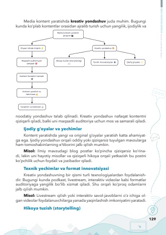 129MEDIASAVODXONLIK bo%u2018yicha metodik qo%u2018llanmaMedia kontent yaratishda kreativ yondashuv juda muhim. Bugungi kunda ko%u2018plab kontentlar orasidan ajralib turish uchun yangilik, ijodiylik va noodatiy yondashuv talab qilinadi. Kreativ yondashuv nafaqat kontentni qiziqarli qiladi, balki uni maqsadli auditoriya uchun mos va samarali qiladi.Ijodiy g%u2018oyalar va yechimlarKontent yaratishda yangi va original g%u2018oyalar yaratish katta ahamiyatga ega. Ijodiy yondashuv orqali oddiy yoki qiziqarsiz tuyulgan mavzularga ham tomoshabinlarning e%u2019tiborini jalb qilish mumkin.Misol: Ilmiy mavzudagi blog postlar ko%u2018pincha qiziqarsiz ko%u2018rinadi, lekin uni hayotiy misollar va qiziqarli hikoya orqali yetkazish bu postni ko%u2018pchilik uchun foydali va jozibador qiladi.Texnik yechimlar va format innovatsiyasiKreativ yondashuvning bir qismi turli texnologiyalardan foydalanishdir. Bugungi kunda podkast, livestream, interaktiv videolar kabi formatlar auditoriyaga yangilik bo%u2018lib xizmat qiladi. Shu orqali ko%u2018proq odamlarni jalb qilish mumkin.Misol: Livestream qilish yoki interaktiv savol-javoblarni o%u2018z ichiga olgan videolar foydalanuvchilarga yanada yaqinlashish imkoniyatini yaratadi.Hikoya tuzish (storytelling)