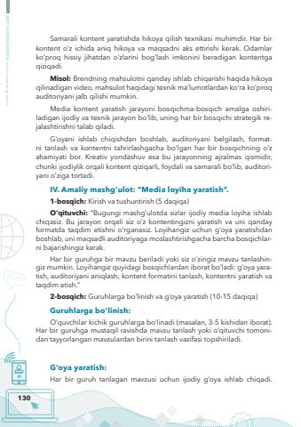 130MEDIASAVODXONLIK bo%u2018yicha metodik qo%u2018llanmaSamarali kontent yaratishda hikoya qilish texnikasi muhimdir. Har bir kontent o%u2018z ichida aniq hikoya va maqsadni aks ettirishi kerak. Odamlar ko%u2018proq hissiy jihatdan o%u2018zlarini bog%u2018lash imkonini beradigan kontentga qiziqadi.Misol: Brendning mahsulotni qanday ishlab chiqarishi haqida hikoya qilinadigan video, mahsulot haqidagi texnik ma%u2019lumotlardan ko%u2018ra ko%u2018proq auditoriyani jalb qilishi mumkin.Media kontent yaratish jarayoni bosqichma-bosqich amalga oshiriladigan ijodiy va texnik jarayon bo%u2018lib, uning har bir bosqichi strategik rejalashtirishni talab qiladi. G%u2018oyani ishlab chiqishdan boshlab, auditoriyani belgilash, formatni tanlash va kontentni tahrirlashgacha bo%u2018lgan har bir bosqichning o%u2018z ahamiyati bor. Kreativ yondashuv esa bu jarayonning ajralmas qismidir, chunki ijodiylik orqali kontent qiziqarli, foydali va samarali bo%u2018lib, auditoriyani o%u2018ziga tortadi.IV. Amaliy mashg%u2018ulot: %u201cMedia loyiha yaratish%u201d.1-bosqich: Kirish va tushuntirish (5 daqiqa)O%u2018qituvchi: %u201cBugungi mashg%u2018ulotda sizlar ijodiy media loyiha ishlab chiqasiz. Bu jarayon orqali siz o%u2018z kontentingizni yaratish va uni qanday formatda taqdim etishni o%u2018rganasiz. Loyihangiz uchun g%u2018oya yaratishdan boshlab, uni maqsadli auditoriyaga moslashtirishgacha barcha bosqichlarni bajarishingiz kerak.Har bir guruhga bir mavzu beriladi yoki siz o%u2018zingiz mavzu tanlashingiz mumkin. Loyihangiz quyidagi bosqichlardan iborat bo%u2018ladi: g%u2018oya yaratish, auditoriyani aniqlash, kontent formatini tanlash, kontentni yaratish va taqdim etish.%u201d2-bosqich: Guruhlarga bo%u2018linish va g%u2018oya yaratish (10-15 daqiqa)Guruhlarga bo%u2018linish:O%u2018quvchilar kichik guruhlarga bo%u2018linadi (masalan, 3-5 kishidan iborat). Har bir guruhga mustaqil ravishda mavzu tanlash yoki o%u2018qituvchi tomonidan tayyorlangan mavzulardan birini tanlash vazifasi topshiriladi.G%u2018oya yaratish:Har bir guruh tanlagan mavzusi uchun ijodiy g%u2018oya ishlab chiqadi.