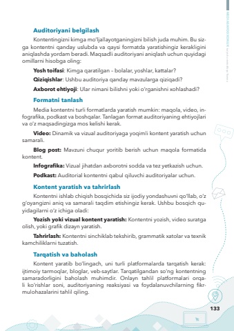 133MEDIASAVODXONLIK bo%u2018yicha metodik qo%u2018llanmaAuditoriyani belgilashKontentingizni kimga mo%u2018ljallayotganingizni bilish juda muhim. Bu sizga kontentni qanday uslubda va qaysi formatda yaratishingiz kerakligini aniqlashda yordam beradi. Maqsadli auditoriyani aniqlash uchun quyidagi omillarni hisobga oling:Yosh toifasi: Kimga qaratilgan %u2013 bolalar, yoshlar, kattalar?Qiziqishlar: Ushbu auditoriya qanday mavzularga qiziqadi?Axborot ehtiyoji: Ular nimani bilishni yoki o%u2018rganishni xohlashadi?Formatni tanlashMedia kontentni turli formatlarda yaratish mumkin: maqola, video, infografika, podkast va boshqalar. Tanlagan format auditoriyaning ehtiyojlari va o%u2018z maqsadingizga mos kelishi kerak.Video: Dinamik va vizual auditoriyaga yoqimli kontent yaratish uchun samarali.Blog post: Mavzuni chuqur yoritib berish uchun maqola formatida kontent.Infografika: Vizual jihatdan axborotni sodda va tez yetkazish uchun.Podkast: Auditorial kontentni qabul qiluvchi auditoriyalar uchun.Kontent yaratish va tahrirlashKontentni ishlab chiqish bosqichida siz ijodiy yondashuvni qo%u2018llab, o%u2018z g%u2018oyangizni aniq va samarali taqdim etishingiz kerak. Ushbu bosqich quyidagilarni o%u2018z ichiga oladi:Yozish yoki vizual kontent yaratish: Kontentni yozish, video suratga olish, yoki grafik dizayn yaratish.Tahrirlash: Kontentni sinchiklab tekshirib, grammatik xatolar va texnik kamchiliklarni tuzatish.Tarqatish va baholashKontent yaratib bo%u2018lingach, uni turli platformalarda tarqatish kerak: ijtimoiy tarmoqlar, bloglar, veb-saytlar. Tarqatilgandan so%u2018ng kontentning samaradorligini baholash muhimdir. Onlayn tahlil platformalari orqali ko%u2018rishlar soni, auditoriyaning reaksiyasi va foydalanuvchilarning fikrmulohazalarini tahlil qiling.