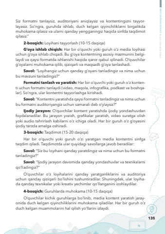 135MEDIASAVODXONLIK bo%u2018yicha metodik qo%u2018llanmaSiz formatni tanlaysiz, auditoriyani aniqlaysiz va kontentingizni tayyorlayasiz. So%u2018ngra, guruhda ishlab, duch kelgan qiyinchiliklarni birgalikda muhokama qilasiz va ularni qanday yengganingiz haqida sinfda taqdimot qilasiz.%u201d2-bosqich: Loyihani tayyorlash (10-15 daqiqa)G%u2018oya ishlab chiqish: Har bir o%u2018quvchi yoki guruh o%u2018z media loyihasi uchun g%u2018oya ishlab chiqadi. Bu g%u2018oya kontentning asosiy mazmunini belgilaydi va qaysi formatda ishlanishi haqida qaror qabul qilinadi. O%u2018quvchilar g%u2018oyalarni muhokama qilib, qiziqarli va maqsadli g%u2018oya tanlashadi.Savol: %u201cLoyihangiz uchun qanday g%u2018oyani tanladingiz va nima uchun bu mavzuni tanladingiz?%u201dFormatni tanlash va yaratish: Har bir o%u2018quvchi yoki guruh o%u2018z kontenti uchun formatni tanlaydi (video, maqola, infografika, podkast va boshqalar). So%u2018ngra, ular kontentni tayyorlashga kirishadi.Savol: %u201cKontentni yaratishda qaysi formatni tanladingiz va nima uchun bu formatni auditoriyangiz uchun samarali deb o%u2018ylaysiz?%u201dIjodiy jarayon: O%u2018quvchilar kontent yaratishda ijodiy yondashuvdan foydalanadilar. Bu jarayon yozish, grafikalar yaratish, video suratga olish yoki audio tahrirlash kabilarni o%u2018z ichiga oladi. Har bir guruh o%u2018z g%u2018oyasini ijodiy tarzda amalga oshiradi.3-bosqich: Taqdimot (15-20 daqiqa)Har bir o%u2018quvchi yoki guruh o%u2018zi yaratgan media kontentni sinfga taqdim qiladi. Taqdimotda ular quyidagi savollarga javob beradilar:Savol: %u201cSiz bu loyihani qanday yaratdingiz va nima uchun bu formatni tanladingiz?%u201dSavol: %u201cIjodiy jarayon davomida qanday yondashuvlar va texnikalarni qo%u2018lladingiz?%u201dO%u2018quvchilar o%u2018z loyihalarini qanday yaratganliklarini va auditoriya uchun qanday qiziqarli bo%u2018lishini tushuntiradilar. Shuningdek, ular loyihada qanday texnikalar yoki kreativ yechimlar qo%u2018llanganini izohlaydilar.4-bosqich: Guruhlarda muhokama (10-15 daqiqa)O%u2018quvchilar kichik guruhlarga bo%u2018linib, media kontent yaratish jarayonida duch kelgan qiyinchiliklarini muhokama qiladilar. Har bir guruh o%u2018z duch kelgan muammolarini hal qilish yo%u2018llarini izlaydi.
