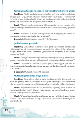 140MEDIASAVODXONLIK bo%u2018yicha metodik qo%u2018llanmaTarmoq xavfsizligi va shaxsiy ma%u2019lumotlarni himoya qilish:Topshiriq: Platformada tarmoq xavfsizligi bo%u2018yicha ba%u2019zi kamchiliklar aniqlangan. O%u2018quvchilar shaxsiy ma%u2019lumotlar xavfsizligini kuchaytirish bo%u2018yicha strategiya ishlab chiqishadi va foydalanuvchilar uchun xavfsizlik qoidalarini tushuntiruvchi qisqa kontent yaratishadi.Savol: %u201cShaxsiy ma%u2019lumotlaringizni himoya qilish uchun qanday choralar ko%u2018rishingiz kerak? Internetda xavfsiz ishlash uchun qanday qoidalar zarur?%u201dMisol: %u201cO%u2018quvchilar kuchli parol yaratish va fishing hujumlaridan himoyalanish uchun maslahatlar tayyorlashadi.%u201d4-bosqich: Media kontent yaratish (15-20 daqiqa)Ijodiy kontent yaratish:Topshiriq: O%u2018quvchilar axborotni tahlil qilish va xavfsizlik qoidalariga oid qiziqarli va informatsion kontent yaratadi. Ular video, infografika yoki maqola formatida ushbu kontentni yaratishadi va maqsadli auditoriyaga moslashtirishadi.Savol: %u201cSiz foydalanuvchilarga tarmoq xavfsizligi va noto%u2018g%u2018ri ma%u2019lumotlardan himoyalanishni qanday qilib qiziqarli va ijodiy tarzda tushuntirasiz?%u201dMisol: %u201cO%u2018quvchilar xavfsizlik bo%u2018yicha qisqa video tayyorlaydi yoki infografika yaratib, foydalanuvchilarga qanday xavflardan qochish kerakligini ko%u2018rsatadi.%u201d5-bosqich: Muloqot etikasi (10 daqiqa)Muloqot qoidalariga rioya qilish:Topshiriq: O%u2018quvchilar platformada foydalanuvchilar bilan muloqot qilishda qanday etika qoidalariga rioya qilish kerakligini tushuntiradilar. Ular konstruktiv muloqotni qo%u2018llab-quvvatlovchi qoidalar ishlab chiqishadi.Savol: %u201cFoydalanuvchilar bilan muloqotda qanday qilib hurmat va mas%u2019uliyatli bo%u2018lish kerak? Shaxsiy hujumlardan va noto%u2018g%u2018ri axborot tarqatishdan qanday qochish mumkin?%u201dMisol: %u201cO%u2018quvchilar foydalanuvchilarga qanday qilib boshqalar fikriga hurmat bilan yondashish va noto%u2018g%u2018ri axborotni tarqatmaslik kerakligini tushuntirishadi.%u201d