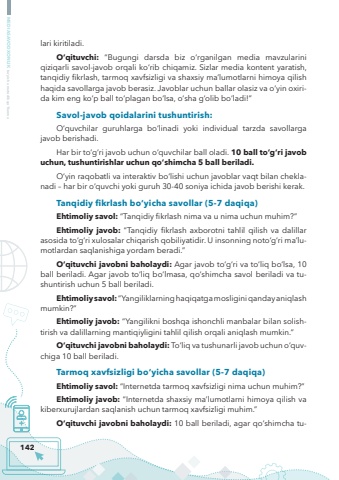 142MEDIASAVODXONLIK bo%u2018yicha metodik qo%u2018llanmalari kiritiladi.O%u2018qituvchi: %u201cBugungi darsda biz o%u2018rganilgan media mavzularini qiziqarli savol-javob orqali ko%u2018rib chiqamiz. Sizlar media kontent yaratish, tanqidiy fikrlash, tarmoq xavfsizligi va shaxsiy ma%u2019lumotlarni himoya qilish haqida savollarga javob berasiz. Javoblar uchun ballar olasiz va o%u2018yin oxirida kim eng ko%u2018p ball to%u2018plagan bo%u2018lsa, o%u2018sha g%u2018olib bo%u2018ladi!%u201dSavol-javob qoidalarini tushuntirish:O%u2018quvchilar guruhlarga bo%u2018linadi yoki individual tarzda savollarga javob berishadi.Har bir to%u2018g%u2018ri javob uchun o%u2018quvchilar ball oladi. 10 ball to%u2018g%u2018ri javob uchun, tushuntirishlar uchun qo%u2018shimcha 5 ball beriladi.O%u2018yin raqobatli va interaktiv bo%u2018lishi uchun javoblar vaqt bilan cheklanadi %u2013 har bir o%u2018quvchi yoki guruh 30-40 soniya ichida javob berishi kerak.Tanqidiy fikrlash bo%u2018yicha savollar (5-7 daqiqa)Ehtimoliy savol: %u201cTanqidiy fikrlash nima va u nima uchun muhim?%u201dEhtimoliy javob: %u201cTanqidiy fikrlash axborotni tahlil qilish va dalillar asosida to%u2018g%u2018ri xulosalar chiqarish qobiliyatidir. U insonning noto%u2018g%u2018ri ma%u2019lumotlardan saqlanishiga yordam beradi.%u201dO%u2018qituvchi javobni baholaydi: Agar javob to%u2018g%u2018ri va to%u2018liq bo%u2018lsa, 10 ball beriladi. Agar javob to%u2018liq bo%u2018lmasa, qo%u2018shimcha savol beriladi va tushuntirish uchun 5 ball beriladi.Ehtimoliy savol: %u201cYangiliklarning haqiqatga mosligini qanday aniqlash mumkin?%u201dEhtimoliy javob: %u201cYangilikni boshqa ishonchli manbalar bilan solishtirish va dalillarning mantiqiyligini tahlil qilish orqali aniqlash mumkin.%u201dO%u2018qituvchi javobni baholaydi: To%u2018liq va tushunarli javob uchun o%u2018quvchiga 10 ball beriladi.Tarmoq xavfsizligi bo%u2018yicha savollar (5-7 daqiqa)Ehtimoliy savol: %u201cInternetda tarmoq xavfsizligi nima uchun muhim?%u201dEhtimoliy javob: %u201cInternetda shaxsiy ma%u2019lumotlarni himoya qilish va kiberxurujlardan saqlanish uchun tarmoq xavfsizligi muhim.%u201dO%u2018qituvchi javobni baholaydi: 10 ball beriladi, agar qo%u2018shimcha tu-