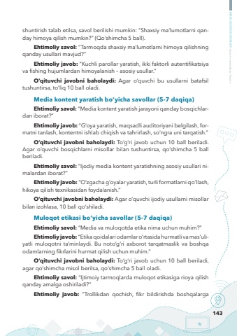 143MEDIASAVODXONLIK bo%u2018yicha metodik qo%u2018llanmashuntirish talab etilsa, savol berilishi mumkin: %u201cShaxsiy ma%u2019lumotlarni qanday himoya qilish mumkin?%u201d (Qo%u2018shimcha 5 ball).Ehtimoliy savol: %u201cTarmoqda shaxsiy ma%u2019lumotlarni himoya qilishning qanday usullari mavjud?%u201dEhtimoliy javob: %u201cKuchli parollar yaratish, ikki faktorli autentifikatsiya va fishing hujumlardan himoyalanish %u2013 asosiy usullar.%u201dO%u2018qituvchi javobni baholaydi: Agar o%u2018quvchi bu usullarni batafsil tushuntirsa, to%u2018liq 10 ball oladi.Media kontent yaratish bo%u2018yicha savollar (5-7 daqiqa)Ehtimoliy savol: %u201cMedia kontent yaratish jarayoni qanday bosqichlardan iborat?%u201dEhtimoliy javob: %u201cG%u2018oya yaratish, maqsadli auditoriyani belgilash, formatni tanlash, kontentni ishlab chiqish va tahrirlash, so%u2018ngra uni tarqatish.%u201dO%u2018qituvchi javobni baholaydi: To%u2018g%u2018ri javob uchun 10 ball beriladi. Agar o%u2018quvchi bosqichlarni misollar bilan tushuntirsa, qo%u2018shimcha 5 ball beriladi.Ehtimoliy savol: %u201cIjodiy media kontent yaratishning asosiy usullari nimalardan iborat?%u201dEhtimoliy javob: %u201cO%u2018zgacha g%u2018oyalar yaratish, turli formatlarni qo%u2018llash, hikoya qilish texnikasidan foydalanish.%u201dO%u2018qituvchi javobni baholaydi: Agar o%u2018quvchi ijodiy usullarni misollar bilan izohlasa, 10 ball qo%u2018shiladi.Muloqot etikasi bo%u2018yicha savollar (5-7 daqiqa)Ehtimoliy savol: %u201cMedia va muloqotda etika nima uchun muhim?%u201dEhtimoliy javob: %u201cEtika qoidalari odamlar o%u2018rtasida hurmatli va mas%u2019uliyatli muloqotni ta%u2019minlaydi. Bu noto%u2018g%u2018ri axborot tarqatmaslik va boshqa odamlarning fikrlarini hurmat qilish uchun muhim.%u201dO%u2018qituvchi javobni baholaydi: To%u2018g%u2018ri javob uchun 10 ball beriladi, agar qo%u2018shimcha misol berilsa, qo%u2018shimcha 5 ball oladi.Ehtimoliy savol: %u201cIjtimoiy tarmoqlarda muloqot etikasiga rioya qilish qanday amalga oshiriladi?%u201dEhtimoliy javob: %u201cTrollikdan qochish, fikr bildirishda boshqalarga