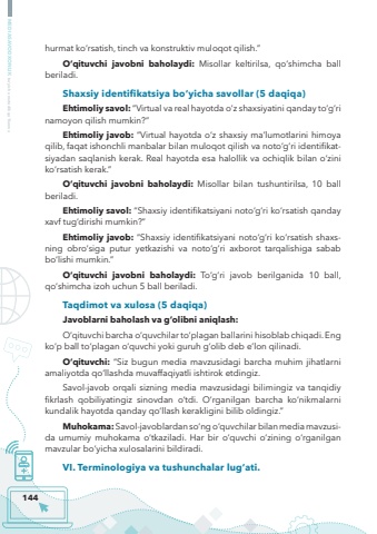 144MEDIASAVODXONLIK bo%u2018yicha metodik qo%u2018llanmahurmat ko%u2018rsatish, tinch va konstruktiv muloqot qilish.%u201dO%u2018qituvchi javobni baholaydi: Misollar keltirilsa, qo%u2018shimcha ball beriladi.Shaxsiy identifikatsiya bo%u2018yicha savollar (5 daqiqa)Ehtimoliy savol: %u201cVirtual va real hayotda o%u2018z shaxsiyatini qanday to%u2018g%u2018ri namoyon qilish mumkin?%u201dEhtimoliy javob: %u201cVirtual hayotda o%u2018z shaxsiy ma%u2019lumotlarini himoya qilib, faqat ishonchli manbalar bilan muloqot qilish va noto%u2018g%u2018ri identifikatsiyadan saqlanish kerak. Real hayotda esa halollik va ochiqlik bilan o%u2018zini ko%u2018rsatish kerak.%u201dO%u2018qituvchi javobni baholaydi: Misollar bilan tushuntirilsa, 10 ball beriladi.Ehtimoliy savol: %u201cShaxsiy identifikatsiyani noto%u2018g%u2018ri ko%u2018rsatish qanday xavf tug%u2018dirishi mumkin?%u201dEhtimoliy javob: %u201cShaxsiy identifikatsiyani noto%u2018g%u2018ri ko%u2018rsatish shaxsning obro%u2018siga putur yetkazishi va noto%u2018g%u2018ri axborot tarqalishiga sabab bo%u2018lishi mumkin.%u201dO%u2018qituvchi javobni baholaydi: To%u2018g%u2018ri javob berilganida 10 ball, qo%u2018shimcha izoh uchun 5 ball beriladi.Taqdimot va xulosa (5 daqiqa)Javoblarni baholash va g%u2018olibni aniqlash:O%u2018qituvchi barcha o%u2018quvchilar to%u2018plagan ballarini hisoblab chiqadi. Eng ko%u2018p ball to%u2018plagan o%u2018quvchi yoki guruh g%u2018olib deb e%u2019lon qilinadi.O%u2018qituvchi: %u201cSiz bugun media mavzusidagi barcha muhim jihatlarni amaliyotda qo%u2018llashda muvaffaqiyatli ishtirok etdingiz.Savol-javob orqali sizning media mavzusidagi bilimingiz va tanqidiy fikrlash qobiliyatingiz sinovdan o%u2018tdi. O%u2018rganilgan barcha ko%u2018nikmalarni kundalik hayotda qanday qo%u2018llash kerakligini bilib oldingiz.%u201dMuhokama: Savol-javoblardan so%u2018ng o%u2018quvchilar bilan media mavzusida umumiy muhokama o%u2018tkaziladi. Har bir o%u2018quvchi o%u2018zining o%u2018rganilgan mavzular bo%u2018yicha xulosalarini bildiradi.VI. Terminologiya va tushunchalar lug%u2018ati.