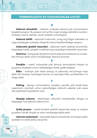 146MEDIASAVODXONLIK bo%u2018yicha metodik qo%u2018llanmaTERMINOLOGIYA VA TUSHUNCHALAR LUG%u2018ATIAAxborot almashish %u2013 odamlar o%u2018rtasida axborot yoki ma%u2019lumotlarni tarqatish jarayoni. Bu jarayon turli yo%u2018llar orqali amalga oshirilishi mumkin: muloqot, yozma matnlar, vizual vositalar va boshqalar.Axborot tahlili %u2013 axborotni tushunish, uning to%u2018g%u2018riligini baholash va unga asoslangan xulosalar chiqarish uchun foydalaniladigan jarayon.Axborotni ajratish mezonlari %u2013 axborotni tahlil qilishda ishonchlilik, haqiqatga moslik, yangilik va dalillarning mavjudligini baholash mezonlari.Antivirus %u2013 kompyuter tizimlarini zararli dasturlar (malware) va viruslardan himoya qilish uchun mo%u2018ljallangan dasturiy ta%u2019minot.EEmojilar %u2013 matnli muloqotda yoki ijtimoiy tarmoqlarda hissiyot va g%u2018oyalarni ifodalash uchun ishlatiladigan kichik grafik belgilari.Etika %u2013 muloqot yoki ishda axloqiy va axborotiy me%u2019yorlarga rioya qilish. Bu boshqa insonlarga hurmat va mas%u2019uliyat bilan yondashishni o%u2018z ichiga oladi.FFishing %u2013 shaxsiy ma%u2019lumotlarni, masalan, parollar yoki kredit karta raqamlarini o%u2018g%u2018irlash uchun yuboriladigan aldovchi xabarlar yoki soxta veb-saytlardan foydalanish usuli.HHaqiqiy axborot %u2013 tekshirilgan, ishonchli manbalardan olingan va haqiqatga mos keluvchi axborot turi.IIjodiy jarayon %u2013 media kontent yaratish jarayonida yangi va original g%u2018oyalarni ishlab chiqish va ularni amaliyotga tatbiq etish.Internet madaniyati %u2013 internetda axborot almashish va muloqot qilish qoidalari va odob-axloq me%u2019yorlari.