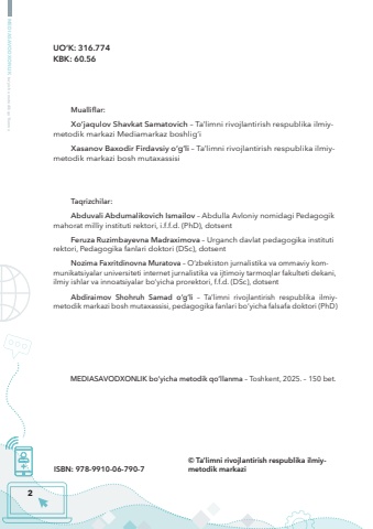 2MEDIASAVODXONLIK bo%u2018yicha metodik qo%u2018llanmaMualliflar:Xo%u2018jaqulov Shavkat Samatovich %u2013 Ta%u2019limni rivojlantirish respublika ilmiymetodik markazi Mediamarkaz boshlig%u2018iXasanov Baxodir Firdavsiy o%u2018g%u2018li %u2013 Ta%u2019limni rivojlantirish respublika ilmiymetodik markazi bosh mutaxassisiTaqrizchilar: Abduvali Abdumalikovich Ismailov %u2013 Abdulla Avloniy nomidagi Pedagogik mahorat milliy instituti rektori, i.f.f.d. (PhD), dotsentFeruza Ruzimbayevna Madraximova %u2013 Urganch davlat pedagogika instituti rektori, Pedagogika fanlari doktori (DSc), dotsent Nozima Faxritdinovna Muratova %u2013 O%u2018zbekiston jurnalistika va ommaviy kommunikatsiyalar universiteti internet jurnalistika va ijtimoiy tarmoqlar fakulteti dekani, ilmiy ishlar va innoatsiyalar bo%u2018yicha prorektori, f.f.d. (DSc), dotsentAbdiraimov Shohruh Samad o%u2018g%u2018li %u2013 Ta%u2019limni rivojlantirish respublika ilmiymetodik markazi bosh mutaxassisi, pedagogika fanlari bo%u2018yicha falsafa doktori (PhD)MEDIASAVODXONLIK bo%u2018yicha metodik qo%u2018llanma %u2013 Toshkent, 2025. %u2013 150 bet.%u00a9 Ta%u2019limni rivojlantirish respublika ilmiyISBN: 978-9910-06-790-7metodik markaziUO%u2018K: 316.774 KBK: 60.56