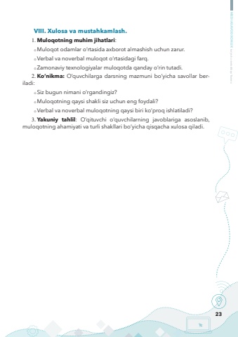 23MEDIASAVODXONLIK bo%u2018yicha metodik qo%u2018llanmaVIII. Xulosa va mustahkamlash.1.Muloqotning muhim jihatlari:oMuloqot odamlar o%u2018rtasida axborot almashish uchun zarur.oVerbal va noverbal muloqot o%u2018rtasidagi farq.oZamonaviy texnologiyalar muloqotda qanday o%u2018rin tutadi.2.Ko%u2018nikma: O%u2018quvchilarga darsning mazmuni bo%u2018yicha savollar beriladi:oSiz bugun nimani o%u2018rgandingiz?oMuloqotning qaysi shakli siz uchun eng foydali?oVerbal va noverbal muloqotning qaysi biri ko%u2018proq ishlatiladi?3.Yakuniy tahlil: O%u2018qituvchi o%u2018quvchilarning javoblariga asoslanib,muloqotning ahamiyati va turli shakllari bo%u2018yicha qisqacha xulosa qiladi.