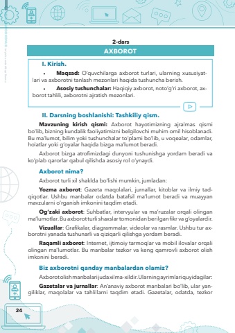 24MEDIASAVODXONLIK bo%u2018yicha metodik qo%u2018llanma 2-dars AXBOROT I. Kirish.%u2022%u0009Maqsad: O%u2018quvchilarga axborot turlari, ularning xususiyatlari va axborotni tanlash mezonlari haqida tushuncha berish.%u2022%u0009Asosiy tushunchalar: Haqiqiy axborot, noto%u2018g%u2018ri axborot, axborot tahlili, axborotni ajratish mezonlari.II. Darsning boshlanishi: Tashkiliy qism.Mavzuning kirish qismi: Axborot hayotimizning ajralmas qismi bo%u2018lib, bizning kundalik faoliyatimizni belgilovchi muhim omil hisoblanadi. Bu ma%u2019lumot, bilim yoki tushunchalar to%u2018plami bo%u2018lib, u voqealar, odamlar, holatlar yoki g%u2018oyalar haqida bizga ma%u2019lumot beradi. Axborot bizga atrofimizdagi dunyoni tushunishga yordam beradi va ko%u2018plab qarorlar qabul qilishda asosiy rol o%u2018ynaydi.Axborot nima?Axborot turli xil shaklda bo%u2018lishi mumkin, jumladan:Yozma axborot: Gazeta maqolalari, jurnallar, kitoblar va ilmiy tadqiqotlar. Ushbu manbalar odatda batafsil ma%u2019lumot beradi va muayyan mavzularni o%u2018rganish imkonini taqdim etadi.Og%u2018zaki axborot: Suhbatlar, intervyular va ma%u2019ruzalar orqali olingan ma%u2019lumotlar. Bu axborot turli shaxslar tomonidan berilgan fikr va g%u2018oyalardir.Vizuallar: Grafikalar, diagrammalar, videolar va rasmlar. Ushbu tur axborotni yanada tushunarli va qiziqarli qilishga yordam beradi.Raqamli axborot: Internet, ijtimoiy tarmoqlar va mobil ilovalar orqali olingan ma%u2019lumotlar. Bu manbalar tezkor va keng qamrovli axborot olish imkonini beradi.Biz axborotni qanday manbalardan olamiz?Axborot olish manbalari juda xilma-xildir. Ularning ayrimlari quyidagilar:Gazetalar va jurnallar: An%u2019anaviy axborot manbalari bo%u2018lib, ular yangiliklar, maqolalar va tahlillarni taqdim etadi. Gazetalar, odatda, tezkor
