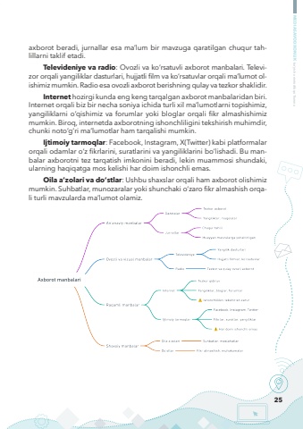 25MEDIASAVODXONLIK bo%u2018yicha metodik qo%u2018llanmaaxborot beradi, jurnallar esa ma%u2019lum bir mavzuga qaratilgan chuqur tahlillarni taklif etadi.Televideniye va radio: Ovozli va ko%u2018rsatuvli axborot manbalari. Televizor orqali yangiliklar dasturlari, hujjatli film va ko%u2018rsatuvlar orqali ma%u2019lumot olishimiz mumkin. Radio esa ovozli axborot berishning qulay va tezkor shaklidir.Internet hozirgi kunda eng keng tarqalgan axborot manbalaridan biri. Internet orqali biz bir necha soniya ichida turli xil ma%u2019lumotlarni topishimiz, yangiliklarni o%u2018qishimiz va forumlar yoki bloglar orqali fikr almashishimiz mumkin. Biroq, internetda axborotning ishonchliligini tekshirish muhimdir, chunki noto%u2018g%u2018ri ma%u2019lumotlar ham tarqalishi mumkin.Ijtimoiy tarmoqlar: Facebook, Instagram, X(Twitter) kabi platformalar orqali odamlar o%u2018z fikrlarini, suratlarini va yangiliklarini bo%u2018lishadi. Bu manbalar axborotni tez tarqatish imkonini beradi, lekin muammosi shundaki, ularning haqiqatga mos kelishi har doim ishonchli emas.Oila a%u2019zolari va do%u2018stlar: Ushbu shaxslar orqali ham axborot olishimiz mumkin. Suhbatlar, munozaralar yoki shunchaki o%u2018zaro fikr almashish orqali turli mavzularda ma%u2019lumot olamiz.
