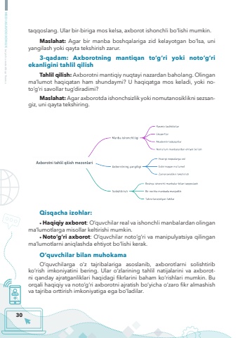 30MEDIASAVODXONLIK bo%u2018yicha metodik qo%u2018llanmataqqoslang. Ular bir-biriga mos kelsa, axborot ishonchli bo%u2018lishi mumkin.Maslahat: Agar bir manba boshqalariga zid kelayotgan bo%u2018lsa, uni yangilash yoki qayta tekshirish zarur.3-qadam: Axborotning mantiqan to%u2018g%u2018ri yoki noto%u2018g%u2018ri ekanligini tahlil qilishTahlil qilish: Axborotni mantiqiy nuqtayi nazardan baholang. Olingan ma%u2019lumot haqiqatan ham shundaymi? U haqiqatga mos keladi, yoki noto%u2018g%u2018ri savollar tug%u2018diradimi?Maslahat: Agar axborotda ishonchsizlik yoki nomutanosiklikni sezsangiz, uni qayta tekshiring.Qisqacha izohlar:%u2022%u0009Haqiqiy axborot: O%u2018quvchilar real va ishonchli manbalardan olingan ma%u2019lumotlarga misollar keltirishi mumkin.%u2022%u0009Noto%u2018g%u2018ri axborot: O%u2018quvchilar noto%u2018g%u2018ri va manipulyatsiya qilingan ma%u2019lumotlarni aniqlashda ehtiyot bo%u2018lishi kerak.O%u2018quvchilar bilan muhokamaO%u2018quvchilarga o%u2018z tajribalariga asoslanib, axborotlarni solishtirib ko%u2018rish imkoniyatini bering. Ular o%u2018zlarining tahlil natijalarini va axborotni qanday ajratganliklari haqidagi fikrlarini baham ko%u2018rishlari mumkin. Bu orqali haqiqiy va noto%u2018g%u2018ri axborotni ajratish bo%u2018yicha o%u2018zaro fikr almashish va tajriba orttirish imkoniyatiga ega bo%u2018ladilar.