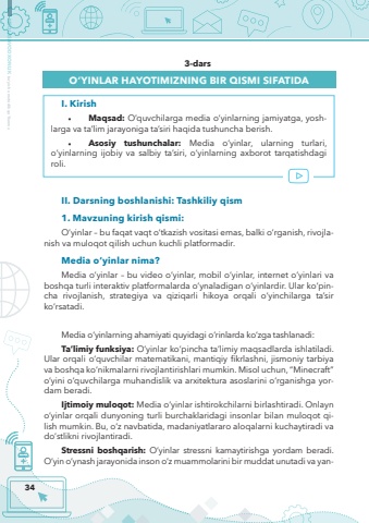 34MEDIASAVODXONLIK bo%u2018yicha metodik qo%u2018llanma3-darsO%u2018YINLAR HAYOTIMIZNING BIR QISMI SIFATIDAI. Kirish%u2022%u0009Maqsad: O%u2018quvchilarga media o%u2018yinlarning jamiyatga, yoshlarga va ta%u2019lim jarayoniga ta%u2019siri haqida tushuncha berish.%u2022%u0009Asosiy tushunchalar: Media o%u2018yinlar, ularning turlari, o%u2018yinlarning ijobiy va salbiy ta%u2019siri, o%u2018yinlarning axborot tarqatishdagi roli.II. Darsning boshlanishi: Tashkiliy qism1. Mavzuning kirish qismi: O%u2018yinlar %u2013 bu faqat vaqt o%u2018tkazish vositasi emas, balki o%u2018rganish, rivojlanish va muloqot qilish uchun kuchli platformadir.Media o%u2018yinlar nima?Media o%u2018yinlar %u2013 bu video o%u2018yinlar, mobil o%u2018yinlar, internet o%u2018yinlari va boshqa turli interaktiv platformalarda o%u2018ynaladigan o%u2018yinlardir. Ular ko%u2018pincha rivojlanish, strategiya va qiziqarli hikoya orqali o%u2018yinchilarga ta%u2019sir ko%u2018rsatadi.Media o%u2018yinlarning ahamiyati quyidagi o%u2018rinlarda ko%u2018zga tashlanadi:Ta%u2019limiy funksiya: O%u2018yinlar ko%u2018pincha ta%u2019limiy maqsadlarda ishlatiladi. Ular orqali o%u2018quvchilar matematikani, mantiqiy fikrlashni, jismoniy tarbiya va boshqa ko%u2018nikmalarni rivojlantirishlari mumkin. Misol uchun, %u201cMinecraft%u201d o%u2018yini o%u2018quvchilarga muhandislik va arxitektura asoslarini o%u2018rganishga yordam beradi.Ijtimoiy muloqot: Media o%u2018yinlar ishtirokchilarni birlashtiradi. Onlayn o%u2018yinlar orqali dunyoning turli burchaklaridagi insonlar bilan muloqot qilish mumkin. Bu, o%u2018z navbatida, madaniyatlararo aloqalarni kuchaytiradi va do%u2018stlikni rivojlantiradi.Stressni boshqarish: O%u2018yinlar stressni kamaytirishga yordam beradi. O%u2018yin o%u2018ynash jarayonida inson o%u2018z muammolarini bir muddat unutadi va yan-