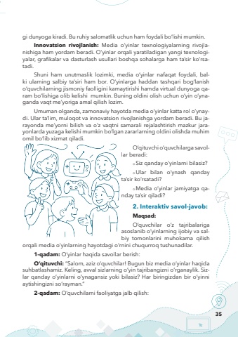 35gi dunyoga kiradi. Bu ruhiy salomatlik uchun ham foydali bo%u2018lishi mumkin.Innovatsion rivojlanish: Media o%u2018yinlar texnologiyalarning rivojlanishiga ham yordam beradi. O%u2018yinlar orqali yaratiladigan yangi texnologiyalar, grafikalar va dasturlash usullari boshqa sohalarga ham ta%u2019sir ko%u2018rsatadi.Shuni ham unutmaslik lozimki, media o%u2018yinlar nafaqat foydali, balki ularning salbiy ta%u2019siri ham bor. O%u2018yinlarga haddan tashqari bog%u2018lanish o%u2018quvchilarning jismoniy faolligini kamaytirishi hamda virtual dunyoga qaram bo%u2018lishiga olib kelishi mumkin. Buning oldini olish uchun o%u2018yin o%u2018ynaganda vaqt me%u2019yoriga amal qilish lozim.Umuman olganda,zamonaviy hayotda media o%u2018yinlar katta rol o%u2018ynaydi. Ular ta%u2019lim, muloqot va innovatsion rivojlanishga yordam beradi. Bu jarayonda me%u2019yorni bilish va o%u2018z vaqtni samarali rejalashtirish mazkur jarayonlarda yuzaga kelishi mumkin bo%u2018lgan zararlarning oldini olishda muhim omil bo%u2018lib xizmat qiladi. O%u2018qituvchi o%u2018quvchilarga savollar beradi:oSiz qanday o%u2018yinlarni bilasiz?oUlar bilan o%u2018ynash qanday ta%u2019sir ko%u2018rsatadi?oMedia o%u2018yinlar jamiyatga qanday ta%u2019sir qiladi?2. Interaktiv savol-javob: Maqsad:O%u2018quvchilar o%u2018z tajribalariga asoslanib o%u2018yinlarning ijobiy va salbiy tomonlarini muhokama qilish orqali media o%u2018yinlarning hayotdagi o%u2018rnini chuqurroq tushunadilar.1-qadam: O%u2018yinlar haqida savollar berish:O%u2018qituvchi: %u201cSalom, aziz o%u2018quvchilar! Bugun biz media o%u2018yinlar haqida suhbatlashamiz. Keling, avval sizlarning o%u2018yin tajribangizni o%u2018rganaylik. Sizlar qanday o%u2018yinlarni o%u2018ynagansiz yoki bilasiz? Har biringizdan bir o%u2018yinni aytishingizni so%u2018rayman.%u201d2-qadam: O%u2018quvchilarni faoliyatga jalb qilish: