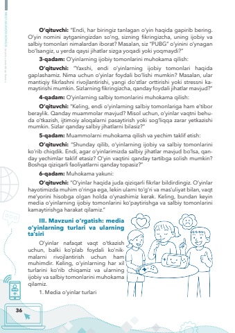 36MEDIASAVODXONLIK bo%u2018yicha metodik qo%u2018llanmaO%u2018qituvchi: %u201cEndi, har biringiz tanlagan o%u2018yin haqida gapirib bering. O%u2018yin nomini aytganingizdan so%u2018ng, sizning fikringizcha, uning ijobiy va salbiy tomonlari nimalardan iborat? Masalan, siz %u201cPUBG%u201d o%u2018yinini o%u2018ynagan bo%u2018lsangiz, u yerda qaysi jihatlar sizga yoqadi yoki yoqmaydi?%u201d3-qadam: O%u2018yinlarning ijobiy tomonlarini muhokama qilish:O%u2018qituvchi: %u201cYaxshi, endi o%u2018yinlarning ijobiy tomonlari haqida gaplashamiz. Nima uchun o%u2018yinlar foydali bo%u2018lishi mumkin? Masalan, ular mantiqiy fikrlashni rivojlantirishi, yangi do%u2018stlar orttirishi yoki stressni kamaytirishi mumkin. Sizlarning fikringizcha, qanday foydali jihatlar mavjud?%u201d4-qadam: O%u2018yinlarning salbiy tomonlarini muhokama qilish:O%u2018qituvchi: %u201cKeling, endi o%u2018yinlarning salbiy tomonlariga ham e%u2019tibor beraylik. Qanday muammolar mavjud? Misol uchun, o%u2018yinlar vaqtni behuda o%u2018tkazish, ijtimoiy aloqalarni pasaytirish yoki sog%u2018liqqa zarar yetkazishi mumkin. Sizlar qanday salbiy jihatlarni bilasiz?%u201d5-qadam: Muammolarni muhokama qilish va yechim taklif etish:O%u2018qituvchi: %u201cShunday qilib, o%u2018yinlarning ijobiy va salbiy tomonlarini ko%u2018rib chiqdik. Endi, agar o%u2018yinlarimizda salbiy jihatlar mavjud bo%u2018lsa, qanday yechimlar taklif etasiz? O%u2018yin vaqtini qanday tartibga solish mumkin? Boshqa qiziqarli faoliyatlarni qanday topasiz?%u201d6-qadam: Muhokama yakuni:O%u2018qituvchi: %u201cO%u2018yinlar haqida juda qiziqarli fikrlar bildirdingiz. O%u2018yinlar hayotimizda muhim o%u2018ringa ega, lekin ularni to%u2018g%u2018ri va mas%u2019uliyat bilan, vaqt me%u2019yorini hisobga olgan holda o%u2018ynashimiz kerak. Keling, bundan keyin media o%u2018yinlarning ijobiy tomonlarini ko%u2018paytirishga va salbiy tomonlarini kamaytirishga harakat qilamiz.%u201dIII. Mavzuni o%u2018rgatish: media o%u2018yinlarning turlari va ularning ta%u2019siriO%u2018yinlar nafaqat vaqt o%u2018tkazish uchun, balki ko%u2018plab foydali ko%u2018nikmalarni rivojlantirish uchun ham muhimdir. Keling, o%u2018yinlarning har xil turlarini ko%u2018rib chiqamiz va ularning ijobiy va salbiy tomonlarini muhokama qilamiz.1. Media o%u2018yinlar turlari