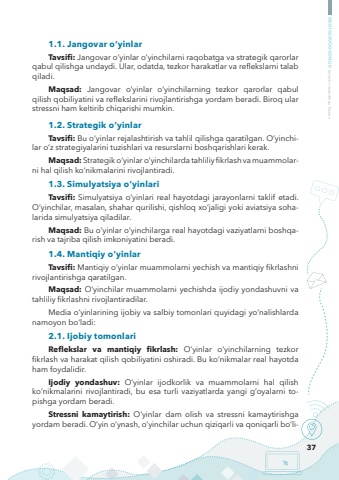 37MEDIASAVODXONLIK bo%u2018yicha metodik qo%u2018llanma1.1. Jangovar o%u2018yinlarTavsifi: Jangovar o%u2018yinlar o%u2018yinchilarni raqobatga va strategik qarorlar qabul qilishga undaydi. Ular, odatda, tezkor harakatlar va reflekslarni talab qiladi.Maqsad: Jangovar o%u2018yinlar o%u2018yinchilarning tezkor qarorlar qabul qilish qobiliyatini va reflekslarini rivojlantirishga yordam beradi. Biroq ular stressni ham keltirib chiqarishi mumkin.1.2. Strategik o%u2018yinlarTavsifi: Bu o%u2018yinlar rejalashtirish va tahlil qilishga qaratilgan. O%u2018yinchilar o%u2018z strategiyalarini tuzishlari va resurslarni boshqarishlari kerak.Maqsad: Strategik o%u2018yinlar o%u2018yinchilarda tahliliy fikrlash va muammolarni hal qilish ko%u2018nikmalarini rivojlantiradi.1.3. Simulyatsiya o%u2018yinlariTavsifi: Simulyatsiya o%u2018yinlari real hayotdagi jarayonlarni taklif etadi. O%u2018yinchilar, masalan, shahar qurilishi, qishloq xo%u2018jaligi yoki aviatsiya sohalarida simulyatsiya qiladilar.Maqsad: Bu o%u2018yinlar o%u2018yinchilarga real hayotdagi vaziyatlarni boshqarish va tajriba qilish imkoniyatini beradi.1.4. Mantiqiy o%u2018yinlarTavsifi: Mantiqiy o%u2018yinlar muammolarni yechish va mantiqiy fikrlashni rivojlantirishga qaratilgan.Maqsad: O%u2018yinchilar muammolarni yechishda ijodiy yondashuvni va tahliliy fikrlashni rivojlantiradilar.Media o%u2018yinlarining ijobiy va salbiy tomonlari quyidagi yo%u2018nalishlarda namoyon bo%u2018ladi:2.1. Ijobiy tomonlariReflekslar va mantiqiy fikrlash: O%u2018yinlar o%u2018yinchilarning tezkor fikrlash va harakat qilish qobiliyatini oshiradi. Bu ko%u2018nikmalar real hayotda ham foydalidir.Ijodiy yondashuv: O%u2018yinlar ijodkorlik va muammolarni hal qilish ko%u2018nikmalarini rivojlantiradi, bu esa turli vaziyatlarda yangi g%u2018oyalarni topishga yordam beradi.Stressni kamaytirish: O%u2018yinlar dam olish va stressni kamaytirishga yordam beradi. O%u2018yin o%u2018ynash, o%u2018yinchilar uchun qiziqarli va qoniqarli bo%u2018li-