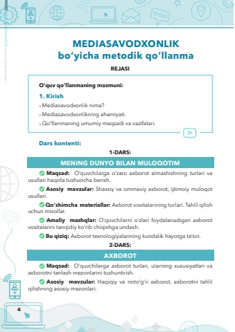 4MEDIASAVODXONLIK bo%u2018yicha metodik qo%u2018llanmaMEDIASAVODXONLIK bo%u2018yicha metodik qo%u2018llanmaREJASIO%u2018quv qo%u2018llanmaning mazmuni:1. KirishoMediasavodxonlik nima?oMediasavodxonlikning ahamiyati.oQo%u2018llanmaning umumiy maqsadi va vazifalari.Dars kontenti:1-DARS: MENING DUNYO BILAN MULOQOTIM%u2705Maqsad: O%u2018quvchilarga o%u2018zaro axborot almashishning turlari va usullari haqida tushuncha berish.%u2705Asosiy mavzular: Shaxsiy va ommaviy axborot, ijtimoiy muloqot usullari.%u2705Qo%u2018shimcha materiallar: Axborot vositalarining turlari. Tahlil qilish uchun misollar.%u2705Amaliy mashqlar: O%u2018quvchilarni o%u2018zlari foydalanadigan axborot vositalarini tanqidiy ko%u2018rib chiqishga undash.%u2705Bu qiziq: Axborot texnologiyalarining kundalik hayotga ta%u2019siri.2-DARS: AXBOROT%u2705Maqsad: O%u2018quvchilarga axborot turlari, ularning xususiyatlari va axborotni tanlash mezonlarini tushuntirish.%u2705Asosiy mavzular: Haqiqiy va noto%u2018g%u2018ri axborot, axborotni tahlil qilishning asosiy mezonlari.