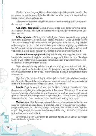 40MEDIASAVODXONLIK bo%u2018yicha metodik qo%u2018llanmaMedia o%u2018yinlar bugungi kunda hayotimizda juda katta o%u2018rin tutadi. Ular axborotni tarqatish, yangi bilimlarni kiritish va ta%u2019lim jarayonini qiziqarli qilishda muhim ahamiyatga ega.O%u2018yinlarning axborot yetkazish vositasi sifatida o%u2018rni quyida jarayonlarda namoyon bo%u2018ladi:Axborotni tarqatish: Media o%u2018yinlar axborotni tarqatishning samarali vositasi sifatida faoliyat ko%u2018rsatadi. Ular quyidagi yo%u2018nalishlarda yordam beradi:Ta%u2019lim o%u2018yinlari: Ta%u2019limga yo%u2018naltirilgan o%u2018yinlar o%u2018quvchilarga yangibilimlarni o%u2018rganish jarayonida qo%u2018l keladi. Masalan, %u201cCodeCombat%u201d o%u2018yini %u2013 bu dasturlashni o%u2018rganish uchun mo%u2018ljallangan o%u2018yin bo%u2018lib, o%u2018quvchilar o%u2018zlarining kod yozish ko%u2018nikmalarini rivojlantirish imkoniyatiga ega bo%u2018ladilar. O%u2018yin jarayonida o%u2018quvchilar turli muammolarni hal qilish uchun kod yozishadi, bu esa ularni haqiqiy dasturlash dunyosiga yaqinlashtiradi.Matematik mantiq o%u2018yinlari: O%u2018quvchilarning mantiqiy fikrlashini rivojlantirishda matematik o%u2018yinlar muhim rol o%u2018ynaydi. Misol uchun, %u201cProdigy Math%u201d o%u2018yini matematik masalalarni hal qilish orqali o%u2018quvchilarning ko%u2018nikmalarini oshirishga yordam beradi. O%u2018yin davomida o%u2018quvchilar har xil darajadagi masalalarni hal qilib, darsni qiziqarli va faol o%u2018tkazadilar. Bu jarayonda o%u2018quvchilar o%u2018z bilimlarini mustahkamlash bilan birga, matematikaga bo%u2018lgan qiziqishlarini ham oshirishadi.O%u2018yinlar ta%u2019lim jarayonini qiziqarli va jalb etuvchi qilishda ham muhim rol o%u2018ynaydi. O%u2018quvchilar o%u2018yin o%u2018ynash jarayonida qiziqish va motivatsiya bilan o%u2018z bilimlarini kengaytiradilar. Ushbu jarayonda:Faollik: O%u2018yinlar orqali o%u2018quvchilar faollik ko%u2018rsatadi, chunki ular o%u2018yin davomida natijalarga erishishga intiladi. Masalan, %u201cMinecraft: Education Edition%u201d o%u2018yinida o%u2018quvchilar o%u2018z qurilmalarini yaratish va boshqarish orqali qiyin vazifalarni bajarishga harakat qilishadi. Bu jarayon ularni o%u2018qituvchi ko%u2018rsatmalari va o%u2018zaro muloqot bilan faol ishtirok etishga undaydi.Motivatsiya: O%u2018yinlar orqali o%u2018quvchilar muvaffaqiyatga erishish uchun ko%u2018proq mehnat qilishga tayyor bo%u2018ladilar. Ular o%u2018yin davomida muvaffaqiyatga erishganda, bu ularning o%u2018ziga bo%u2018lgan ishonchini oshiradi. O%u2018yinlar orqali olingan qiziqish va motivatsiya o%u2018quvchilarning bilim olish jarayonini qiziqarli va samararali qiladi.O%u2018yinlardan ta%u2019lim jarayonlarida samarali foydalanish uchun quyidagi jihatlarini e%u2019tiborga olish lozim: