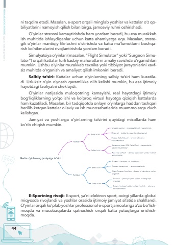 44MEDIASAVODXONLIK bo%u2018yicha metodik qo%u2018llanmani taqdim etadi. Masalan, e-sport orqali minglab yoshlar va kattalar o%u2018z qobiliyatlarini namoyish qilish bilan birga, jamoaviy ruhni oshirishadi. O%u2018yinlar stressni kamaytirishda ham yordam beradi, bu esa murakkab ish muhitida ishlaydiganlar uchun katta ahamiyatga ega. Masalan, strategik o%u2018yinlar mantiqiy fikrlashni o%u2018stirishda va katta ma%u2019lumotlarni boshqarish ko%u2018nikmalarini rivojlantirishda yordam beradi.Simulyatsiya o%u2018yinlari (masalan, %u201cFlight Simulator%u201d yoki %u201cSurgeon Simulator%u201d) orqali kattalar turli kasbiy mahoratlarni amaliy ravishda o%u2018rganishlari mumkin. Ushbu o%u2018yinlar murakkab texnika yoki tibbiyot jarayonlarini xavfsiz muhitda o%u2018rganish va amaliyot qilish imkonini beradi.Salbiy ta%u2019siri: Kattalar uchun o%u2018yinlarning salbiy ta%u2019siri ham kuzatiladi. Uzluksiz o%u2018yin o%u2018ynash qaramlikka olib kelishi mumkin, bu esa ijtimoiy hayotdagi faoliyatni cheklaydi. O%u2018yinlar natijasida muloqotning kamayishi, real hayotdagi ijtimoiy bog%u2018liqliklarning yo%u2018qolishi va ko%u2018proq virtual hayotga qiziqish kattalarda ham kuzatiladi. Masalan, bir tadqiqotda onlayn o%u2018yinlarga haddan tashqari berilib ketgan kattalar oilaviy va ish munosabatlarida muammolarga duch kelishgan.Jamiyat va yoshlarga o%u2018yinlarning ta%u2019sirini quyidagi misollarda ham ko%u2018rib chiqish mumkin.E-Sportning rivoji: E-sport, ya%u2019ni elektron sport, oxirgi yillarda globalmiqyosda rivojlandi va yoshlar orasida ijtimoiy jamiyat sifatida shakllandi. O%u2018yinlar orqali ko%u2018plab yoshlar professional e-sport jamoalariga a%u2019zo bo%u2018lishmoqda va musobaqalarda qatnashish orqali katta yutuqlarga erishishmoqda.