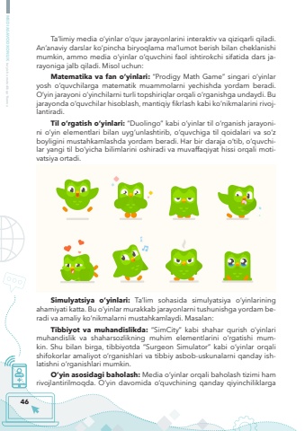46MEDIASAVODXONLIK bo%u2018yicha metodik qo%u2018llanmaTa%u2019limiy media o%u2018yinlar o%u2018quv jarayonlarini interaktiv va qiziqarli qiladi. An%u2019anaviy darslar ko%u2018pincha biryoqlama ma%u2019lumot berish bilan cheklanishi mumkin, ammo media o%u2018yinlar o%u2018quvchini faol ishtirokchi sifatida dars jarayoniga jalb qiladi. Misol uchun:Matematika va fan o%u2018yinlari: %u201cProdigy Math Game%u201d singari o%u2018yinlar yosh o%u2018quvchilarga matematik muammolarni yechishda yordam beradi. O%u2018yin jarayoni o%u2018yinchilarni turli topshiriqlar orqali o%u2018rganishga undaydi. Bu jarayonda o%u2018quvchilar hisoblash, mantiqiy fikrlash kabi ko%u2018nikmalarini rivojlantiradi.Til o%u2018rgatish o%u2018yinlari: %u201cDuolingo%u201d kabi o%u2018yinlar til o%u2018rganish jarayonini o%u2018yin elementlari bilan uyg%u2018unlashtirib, o%u2018quvchiga til qoidalari va so%u2018z boyligini mustahkamlashda yordam beradi. Har bir daraja o%u2018tib, o%u2018quvchilar yangi til bo%u2018yicha bilimlarini oshiradi va muvaffaqiyat hissi orqali motivatsiya ortadi.Simulyatsiya o%u2018yinlari: Ta%u2019lim sohasida simulyatsiya o%u2018yinlarining ahamiyati katta. Bu o%u2018yinlar murakkab jarayonlarni tushunishga yordam beradi va amaliy ko%u2018nikmalarni mustahkamlaydi. Masalan:Tibbiyot va muhandislikda: %u201cSimCity%u201d kabi shahar qurish o%u2018yinlari muhandislik va shaharsozlikning muhim elementlarini o%u2018rgatishi mumkin. Shu bilan birga, tibbiyotda %u201cSurgeon Simulator%u201d kabi o%u2018yinlar orqali shifokorlar amaliyot o%u2018rganishlari va tibbiy asbob-uskunalarni qanday ishlatishni o%u2018rganishlari mumkin.O%u2018yin asosidagi baholash: Media o%u2018yinlar orqali baholash tizimi ham rivojlantirilmoqda. O%u2018yin davomida o%u2018quvchining qanday qiyinchiliklarga