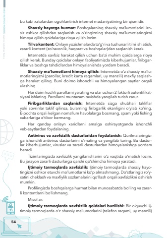 54MEDIASAVODXONLIK bo%u2018yicha metodik qo%u2018llanmabu kabi xatolardan ogohlantirish internet madaniyatining bir qismidir.Shaxsiy hayotga hurmat: Boshqalarning shaxsiy ma%u2019lumotlarini iznsiz oshkor qilishdan saqlanish va o%u2018zingizning shaxsiy ma%u2019lumotlaringizni himoya qilish qoidalariga rioya qilish lozim.Til va kontent: Onlayn yozishmalarda to%u2018g%u2018ri va tushunarli tilni ishlatish, zararli kontent (zo%u2018ravonlik, haqorat va boshqalar)dan saqlanish kerak.Internetda xavfsiz harakat qilish uchun ba%u2019zi muhim qoidalarga rioya qilish kerak. Bunday qoidalar onlayn faoliyatimizda kiberhujumlar, firibgarliklar va boshqa tahdidlardan himoyalanishda yordam beradi.Shaxsiy ma%u2019lumotlarni himoya qilish: Internetda o%u2018z shaxsiy ma%u2019lumotlaringizni (parollar, kredit karta raqamlari, uy manzili) maxfiy saqlashga harakat qiling. Buni doimo ishonchli va himoyalangan saytlar orqali ulashing.Har doim kuchli parollarni yarating va ular uchun 2 faktorli autentifikatsiyani ishlating. Parollarni muntazam ravishda yangilab turish zarur.Firibgarliklardan saqlanish: Internetda sizga shubhali takliflar yoki sovrinlar taklif qilinsa, bularning firibgarlik ekanligini o%u2018ylab ko%u2018ring. E-pochta orqali kelgan noma%u2019lum havolalarga bosmang, spam yoki fishing xabarlariga e%u2019tibor bermang.Har qanday onlayn xaridlarni amalga oshirayotganda ishonchli veb-saytlardan foydalaning.Antivirus va xavfsizlik dasturlaridan foydalanish: Qurilmalaringizga ishonchli antivirus dasturlarini o%u2018rnating va yangilab turing. Bu dasturlar kiberhujumlar, viruslar va zararli dasturlardan himoyalanishga yordam beradi.Tizimlaringizda xavfsizlik yangilanishlarini o%u2018z vaqtida o%u2018rnatish lozim. Bu jarayon zararli dasturlarga qarshi qo%u2018shimcha himoya yaratadi.Ijtimoiy tarmoqlarda xavfsizlik: Ijtimoiy tarmoqlarda shaxsiy hayotingizni oshkor etuvchi ma%u2019lumotlarni ko%u2018p almashmang. Do%u2018stlaringiz ro%u2018yxatini cheklash va maxfiylik sozlamalarini qo%u2018llash orqali xavfsizlikni oshirish mumkin.Profilingizda boshqalarga hurmat bilan munosabatda bo%u2018ling va zararli kontentlarni bo%u2018lishmang.Misollar:Ijtimoiy tarmoqlarda xavfsizlik qoidalari buzilishi: Bir o%u2018quvchi ijtimoiy tarmoqlarda o%u2018z shaxsiy ma%u2019lumotlarini (telefon raqami, uy manzili)