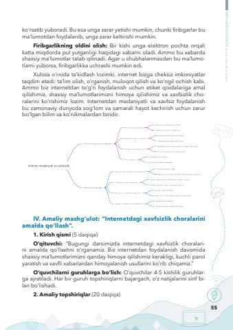 55MEDIASAVODXONLIK bo%u2018yicha metodik qo%u2018llanmako%u2018rsatib yuboradi. Bu esa unga zarar yetishi mumkin, chunki firibgarlar bu ma%u2019lumotdan foydalanib, unga zarar keltirishi mumkin.Firibgarlikning oldini olish: Bir kishi unga elektron pochta orqali katta miqdorda pul yutganligi haqidagi xabarni oladi. Ammo bu xabarda shaxsiy ma%u2019lumotlar talab qilinadi. Agar u shubhalanmasdan bu ma%u2019lumotlarni yuborsa, firibgarlikka uchrashi mumkin edi.Xulosa o%u2018rnida ta%u2019kidlash lozimki, internet bizga cheksiz imkoniyatlar taqdim etadi: ta%u2019lim olish, o%u2018rganish, muloqot qilish va ko%u2018ngil ochish kabi. Ammo biz internetdan to%u2018g%u2018ri foydalanish uchun etiket qoidalariga amal qilishimiz, shaxsiy ma%u2019lumotlarimizni himoya qilishimiz va xavfsizlik choralarini ko%u2018rishimiz lozim. Internetdan madaniyatli va xavfsiz foydalanish bu zamonaviy dunyoda sog%u2018lom va samarali hayot kechirish uchun zarur bo%u2018lgan bilim va ko%u2018nikmalardan biridir.IV. Amaliy mashg%u2018ulot: %u201cInternetdagi xavfsizlik choralarini amalda qo%u2018llash%u201d.1. Kirish qismi (5 daqiqa)O%u2018qituvchi: %u201cBugungi darsimizda internetdagi xavfsizlik choralarini amalda qo%u2018llashni o%u2018rganamiz. Biz internetdan foydalanish davomida shaxsiy ma%u2019lumotlarimizni qanday himoya qilishimiz kerakligi, kuchli parol yaratish va xavfli xabarlardan himoyalanish usullarini ko%u2018rib chiqamiz.%u201dO%u2018quvchilarni guruhlarga bo%u2018lish: O%u2018quvchilar 4-5 kishilik guruhlarga ajratiladi. Har bir guruh topshiriqlarni bajargach, o%u2018z natijalarini sinf bilan bo%u2018lishadi.2. Amaliy topshiriqlar (20 daqiqa)