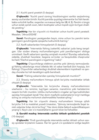 56MEDIASAVODXONLIK bo%u2018yicha metodik qo%u2018llanma2.1. Kuchli parol yaratish (5 daqiqa)O%u2018qituvchi: %u201cKuchli parol sizning hisoblaringizni xavfsiz saqlashning asosiy usullaridan biridir. Kuchli parolda quyidagi elementlar bo%u2018lishi kerak: katta va kichik harflar, raqamlar va maxsus belg ilar (@, #, $). Parolni o%u2018zingiz uchun eslab qolish oson, lekin boshqalar uchun topish qiyin bo%u2018lgan shaklda yarating.%u201dTopshiriq: Har bir o%u2018quvchi o%u2018z hisoblari uchun kuchli parol yaratadi. Masalan, %u201cJ4nus!2024$%u201d.Savol: Parolingizni yaratgandan keyin, nima uchun bu parolni tanlaganingizni guruhingizda qisqacha tushuntirib bering.%u201d2.2. Xavfli xabarlardan himoyalanish (5 daqiqa)O%u2018qituvchi: %u201cInternetda fishing (xakerlik) xabarlari juda keng tarqalgan. Ular sizdan shaxsiy ma%u2019lumotlaringizni yoki parollaringizni olishga urinishadi. Xavfli xabarlarni qanday aniqlash mumkin? Bunday xabarlarda, odatda, shubhali havolalar, begona so%u2018rovlar va favqulodda chaqiruvlar bo%u2018ladi (%u201cDarhol parolingizni o%u2018zgartiring%u201d kabi).%u201dTopshiriq: O%u2018quvchilarga elektron pochta yoki ijtimoiy tarmoqlardagi fishing xabarlariga misol sifatida ikki xil xabar beriladi (biri haqiqiy, biri fishing). O%u2018quvchilar xabarlardagi shubhali elementlarni topishadi va qanday choralar ko%u2018rish kerakligini aytib berishadi.Savol: %u201cFishing xabarlaridan qanday himoyalanish mumkin?%u201d2.3. Shaxsiy ma%u2019lumotlarni himoya qilish bo%u2018yicha maslahatlar ishlab chiqish (5 daqiqa)O%u2018qituvchi: %u201cInternetda biz ko%u2018pincha shaxsiy ma%u2019lumotlarimizni ulashamiz %u2013 bu ismimiz, tug%u2018ilgan sanamiz, manzilimiz yoki kartalarimiz raqami bo%u2018lishi mumkin. Ushbu ma%u2019lumotlarni o%u2018zgalar qo%u2018liga tushishidan qanday himoyalash kerak? Har doim maxfiylik sozlamalarini to%u2018g%u2018ri tartibga soling va ortiqcha ma%u2019lumot ulashmaslikka harakat qiling.%u201dTopshiriq: Har bir o%u2018quvchi shaxsiy ma%u2019lumotlarni himoya qilish bo%u2018yicha 3-4 ta maslahat yozadi (masalan, %u201cIjtimoiy tarmoqlarda faqat tanish odamlar bilan do%u2018st bo%u2018ling%u201d, %u201cHar doim ikkita faktorli autentifikatsiyani yoqing%u201d). Keyin ular o%u2018z maslahatlarini guruh bilan bo%u2018lishadilar.3. Guruhli mashq: Internetda xavfsiz ishlash qoidalarini yaratish(10 daqiqa)O%u2018qituvchi: %u201cEndi guruhingizda internetda xavfsiz ishlash uchun asosiy qoidalar to%u2018plamini tuzasiz. Har bir guruh o%u2018z qoidalarini sinfga taqdim