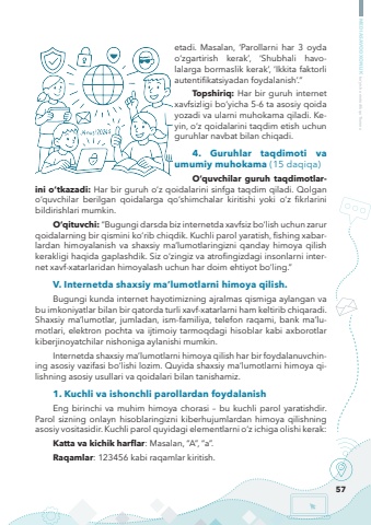 57MEDIASAVODXONLIK bo%u2018yicha metodik qo%u2018llanmaetadi. Masalan, %u2018Parollarni har 3 oyda o%u2018zgartirish kerak%u2019, %u2018Shubhali havolalarga bormaslik kerak%u2019, %u2018Ikkita faktorli autentifikatsiyadan foydalanish%u2019.%u201dTopshiriq: Har bir guruh internet xavfsizligi bo%u2018yicha 5-6 ta asosiy qoida yozadi va ularni muhokama qiladi. Keyin, o%u2018z qoidalarini taqdim etish uchun guruhlar navbat bilan chiqadi.4. Guruhlar taqdimoti va umumiy muhokama (15 daqiqa)O%u2018quvchilar guruh taqdimotlarini o%u2018tkazadi: Har bir guruh o%u2018z qoidalarini sinfga taqdim qiladi. Qolgan o%u2018quvchilar berilgan qoidalarga qo%u2018shimchalar kiritishi yoki o%u2018z fikrlarini bildirishlari mumkin.O%u2018qituvchi: %u201cBugungi darsda biz internetda xavfsiz bo%u2018lish uchun zarur qoidalarning bir qismini ko%u2018rib chiqdik. Kuchli parol yaratish, fishing xabarlardan himoyalanish va shaxsiy ma%u2019lumotlaringizni qanday himoya qilish kerakligi haqida gaplashdik. Siz o%u2018zingiz va atrofingizdagi insonlarni internet xavf-xatarlaridan himoyalash uchun har doim ehtiyot bo%u2018ling.%u201dV. Internetda shaxsiy ma%u2019lumotlarni himoya qilish.Bugungi kunda internet hayotimizning ajralmas qismiga aylangan va bu imkoniyatlar bilan bir qatorda turli xavf-xatarlarni ham keltirib chiqaradi. Shaxsiy ma%u2019lumotlar, jumladan, ism-familiya, telefon raqami, bank ma%u2019lumotlari, elektron pochta va ijtimoiy tarmoqdagi hisoblar kabi axborotlar kiberjinoyatchilar nishoniga aylanishi mumkin. Internetda shaxsiy ma%u2019lumotlarni himoya qilish har bir foydalanuvchining asosiy vazifasi bo%u2018lishi lozim. Quyida shaxsiy ma%u2019lumotlarni himoya qilishning asosiy usullari va qoidalari bilan tanishamiz.1. Kuchli va ishonchli parollardan foydalanishEng birinchi va muhim himoya chorasi %u2013 bu kuchli parol yaratishdir. Parol sizning onlayn hisoblaringizni kiberhujumlardan himoya qilishning asosiy vositasidir. Kuchli parol quyidagi elementlarni o%u2018z ichiga olishi kerak:Katta va kichik harflar: Masalan, %u201cA%u201d, %u201ca%u201d.Raqamlar: 123456 kabi raqamlar kiritish.