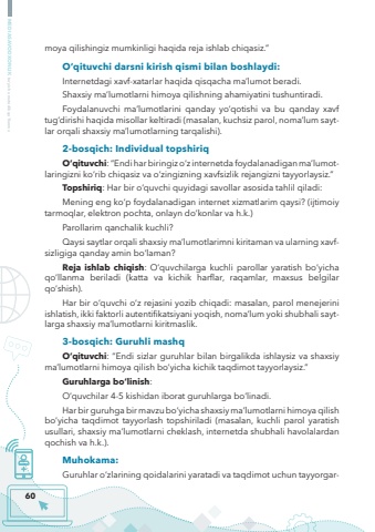 60MEDIASAVODXONLIK bo%u2018yicha metodik qo%u2018llanmamoya qilishingiz mumkinligi haqida reja ishlab chiqasiz.%u201dO%u2018qituvchi darsni kirish qismi bilan boshlaydi:Internetdagi xavf-xatarlar haqida qisqacha ma%u2019lumot beradi.Shaxsiy ma%u2019lumotlarni himoya qilishning ahamiyatini tushuntiradi.Foydalanuvchi ma%u2019lumotlarini qanday yo%u2018qotishi va bu qanday xavf tug%u2018dirishi haqida misollar keltiradi (masalan, kuchsiz parol, noma%u2019lum saytlar orqali shaxsiy ma%u2019lumotlarning tarqalishi).2-bosqich: Individual topshiriqO%u2018qituvchi: %u201cEndi har biringiz o%u2018z internetda foydalanadigan ma%u2019lumotlaringizni ko%u2018rib chiqasiz va o%u2018zingizning xavfsizlik rejangizni tayyorlaysiz.%u201dTopshiriq: Har bir o%u2018quvchi quyidagi savollar asosida tahlil qiladi:Mening eng ko%u2018p foydalanadigan internet xizmatlarim qaysi? (ijtimoiy tarmoqlar, elektron pochta, onlayn do%u2018konlar va h.k.)Parollarim qanchalik kuchli?Qaysi saytlar orqali shaxsiy ma%u2019lumotlarimni kiritaman va ularning xavfsizligiga qanday amin bo%u2018laman?Reja ishlab chiqish: O%u2018quvchilarga kuchli parollar yaratish bo%u2018yicha qo%u2018llanma beriladi (katta va kichik harflar, raqamlar, maxsus belgilar qo%u2018shish).Har bir o%u2018quvchi o%u2018z rejasini yozib chiqadi: masalan, parol menejerini ishlatish, ikki faktorli autentifikatsiyani yoqish, noma%u2019lum yoki shubhali saytlarga shaxsiy ma%u2019lumotlarni kiritmaslik.3-bosqich: Guruhli mashqO%u2018qituvchi: %u201cEndi sizlar guruhlar bilan birgalikda ishlaysiz va shaxsiy ma%u2019lumotlarni himoya qilish bo%u2018yicha kichik taqdimot tayyorlaysiz.%u201dGuruhlarga bo%u2018linish:O%u2018quvchilar 4-5 kishidan iborat guruhlarga bo%u2018linadi.Har bir guruhga bir mavzu bo%u2018yicha shaxsiy ma%u2019lumotlarni himoya qilish bo%u2018yicha taqdimot tayyorlash topshiriladi (masalan, kuchli parol yaratish usullari, shaxsiy ma%u2019lumotlarni cheklash, internetda shubhali havolalardan qochish va h.k.).Muhokama:Guruhlar o%u2018zlarining qoidalarini yaratadi va taqdimot uchun tayyorgar