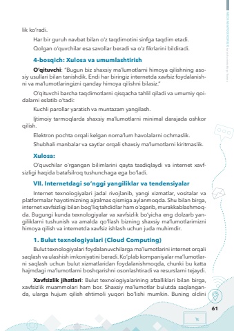 61MEDIASAVODXONLIK bo%u2018yicha metodik qo%u2018llanmalik ko%u2018radi.Har bir guruh navbat bilan o%u2018z taqdimotini sinfga taqdim etadi.Qolgan o%u2018quvchilar esa savollar beradi va o%u2018z fikrlarini bildiradi.4-bosqich: Xulosa va umumlashtirishO%u2018qituvchi: %u201cBugun biz shaxsiy ma%u2019lumotlarni himoya qilishning asosiy usullari bilan tanishdik. Endi har biringiz internetda xavfsiz foydalanishni va ma%u2019lumotlaringizni qanday himoya qilishni bilasiz.%u201dO%u2018qituvchi barcha taqdimotlarni qisqacha tahlil qiladi va umumiy qoidalarni eslatib o%u2018tadi:Kuchli parollar yaratish va muntazam yangilash.Ijtimoiy tarmoqlarda shaxsiy ma%u2019lumotlarni minimal darajada oshkor qilish.Elektron pochta orqali kelgan noma%u2019lum havolalarni ochmaslik.Shubhali manbalar va saytlar orqali shaxsiy ma%u2019lumotlarni kiritmaslik.Xulosa:O%u2018quvchilar o%u2018rgangan bilimlarini qayta tasdiqlaydi va internet xavfsizligi haqida batafsilroq tushunchaga ega bo%u2018ladi.VII. Internetdagi so%u2018nggi yangiliklar va tendensiyalarInternet texnologiyalari jadal rivojlanib, yangi xizmatlar, vositalar va platformalar hayotimizning ajralmas qismiga aylanmoqda. Shu bilan birga, internet xavfsizligi bilan bog%u2018liq tahdidlar ham o%u2018zgarib, murakkablashmoqda. Bugungi kunda texnologiyalar va xavfsizlik bo%u2018yicha eng dolzarb yangiliklarni tushunish va amalda qo%u2018llash bizning shaxsiy ma%u2019lumotlarimizni himoya qilish va internetda xavfsiz ishlash uchun juda muhimdir.1. Bulut texnologiyalari (Cloud Computing)Bulut texnologiyalari foydalanuvchilarga ma%u2019lumotlarini internet orqali saqlash va ulashish imkoniyatini beradi. Ko%u2018plab kompaniyalar ma%u2019lumotlarni saqlash uchun bulut xizmatlaridan foydalanishmoqda, chunki bu katta hajmdagi ma%u2019lumotlarni boshqarishni osonlashtiradi va resurslarni tejaydi.Xavfsizlik jihatlari: Bulut texnologiyalarining afzalliklari bilan birga, xavfsizlik muammolari ham bor. Shaxsiy ma%u2019lumotlar bulutda saqlanganda, ularga hujum qilish ehtimoli yuqori bo%u2018lishi mumkin. Buning oldini