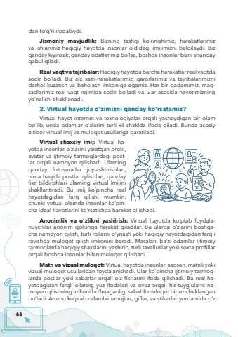 66dan-to%u2018g%u2018ri ifodalaydi.Jismoniy mavjudlik: Bizning tashqi ko%u2018rinishimiz, harakatlarimiz va ishlarimiz haqiqiy hayotda insonlar oldidagi imijimizni belgilaydi. Biz qanday kiyinsak, qanday odatlarimiz bo%u2018lsa, boshqa insonlar bizni shunday qabul qiladi.Real vaqt va tajribalar: Haqiqiy hayotda barcha harakatlar real vaqtda sodir bo%u2018ladi. Biz o%u2018z xatti-harakatlarimiz, qarorlarimiz va tajribalarimizni darhol kuzatish va baholash imkoniga egamiz. Har bir qadamimiz, maqsadlarimiz real vaqt rejimida sodir bo%u2018ladi va ular asosida hayotimizning yo%u2018nalishi shakllanadi.2. Virtual hayotda o%u2018zimizni qanday ko%u2018rsatamiz?Virtual hayot internet va texnologiyalar orqali yashaydigan bir olam bo%u2018lib, unda odamlar o%u2018zlarini turli xil shaklda ifoda qiladi. Bunda asosiy e%u2019tibor virtual imij va muloqot usullariga qaratiladi.Virtual shaxsiy imij: Virtual hayotda insonlar o%u2018zlarini yaratgan profil, avatar va ijtimoiy tarmoqlardagi postlar orqali namoyon qilishadi. Ularning qanday fotosuratlar joylashtirishlari, nima haqida postlar qilishlari, qanday fikr bildirishlari ularning virtual imijini shakllantiradi. Bu imij ko%u2018pincha real hayotdagidan farq qilishi mumkin, chunki virtual olamda insonlar ko%u2018pincha ideal hayotlarini ko%u2018rsatishga harakat qilishadi.Anonimlik va o%u2018zlikni yashirish: Virtual hayotda ko%u2018plab foydalanuvchilar anonim qolishga harakat qiladilar. Bu ularga o%u2018zlarini boshqacha namoyon qilish, turli rollarni o%u2018ynash yoki haqiqiy hayotdagidan farqli ravishda muloqot qilish imkonini beradi. Masalan, ba%u2019zi odamlar ijtimoiy tarmoqlarda haqiqiy shaxslarini yashirib, turli taxalluslar yoki soxta profillar orqali boshqa insonlar bilan muloqot qilishadi.Matn va vizual muloqot: Virtual hayotda insonlar, asosan, matnli yoki vizual muloqot usullaridan foydalanishadi. Ular ko%u2018pincha ijtimoiy tarmoqlarda postlar yoki xabarlar orqali o%u2018z fikrlarini ifoda qilishadi. Bu real hayotdagidan farqli o%u2018laroq, yuz ifodalari va ovoz orqali his-tuyg%u2018ularni namoyon qilishning imkoni bo%u2018lmaganligi sababli muloqot bir oz cheklangan bo%u2018ladi. Ammo ko%u2018plab odamlar emojilar, giflar, va stikerlar yordamida o%u2018z