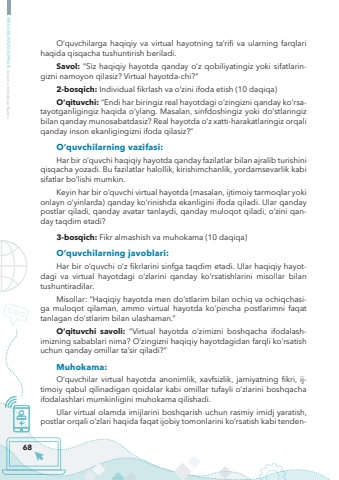 68MEDIASAVODXONLIK bo%u2018yicha metodik qo%u2018llanmaO%u2018quvchilarga haqiqiy va virtual hayotning ta%u2019rifi va ularning farqlari haqida qisqacha tushuntirish beriladi.Savol: %u201cSiz haqiqiy hayotda qanday o%u2018z qobiliyatingiz yoki sifatlaringizni namoyon qilasiz? Virtual hayotda-chi?%u201d2-bosqich: Individual fikrlash va o%u2018zini ifoda etish (10 daqiqa)O%u2018qituvchi: %u201cEndi har biringiz real hayotdagi o%u2018zingizni qanday ko%u2018rsatayotganligingiz haqida o%u2018ylang. Masalan, sinfdoshingiz yoki do%u2018stlaringiz bilan qanday munosabatdasiz? Real hayotda o%u2018z xatti-harakatlaringiz orqali qanday inson ekanligingizni ifoda qilasiz?%u201dO%u2018quvchilarning vazifasi:Har bir o%u2018quvchi haqiqiy hayotda qanday fazilatlar bilan ajralib turishini qisqacha yozadi. Bu fazilatlar halollik, kirishimchanlik, yordamsevarlik kabi sifatlar bo%u2018lishi mumkin.Keyin har bir o%u2018quvchi virtual hayotda (masalan, ijtimoiy tarmoqlar yoki onlayn o%u2018yinlarda) qanday ko%u2018rinishda ekanligini ifoda qiladi. Ular qanday postlar qiladi, qanday avatar tanlaydi, qanday muloqot qiladi, o%u2018zini qanday taqdim etadi?3-bosqich: Fikr almashish va muhokama (10 daqiqa)O%u2018quvchilarning javoblari:Har bir o%u2018quvchi o%u2018z fikrlarini sinfga taqdim etadi. Ular haqiqiy hayotdagi va virtual hayotdagi o%u2018zlarini qanday ko%u2018rsatishlarini misollar bilan tushuntiradilar.Misollar: %u201cHaqiqiy hayotda men do%u2018stlarim bilan ochiq va ochiqchasiga muloqot qilaman, ammo virtual hayotda ko%u2018pincha postlarimni faqat tanlagan do%u2018stlarim bilan ulashaman.%u201dO%u2018qituvchi savoli: %u201cVirtual hayotda o%u2018zimizni boshqacha ifodalashimizning sabablari nima? O%u2018zingizni haqiqiy hayotdagidan farqli ko%u2018rsatish uchun qanday omillar ta%u2019sir qiladi?%u201dMuhokama:O%u2018quvchilar virtual hayotda anonimlik, xavfsizlik, jamiyatning fikri, ijtimoiy qabul qilinadigan qoidalar kabi omillar tufayli o%u2018zlarini boshqacha ifodalashlari mumkinligini muhokama qilishadi.Ular virtual olamda imijlarini boshqarish uchun rasmiy imidj yaratish, postlar orqali o%u2018zlari haqida faqat ijobiy tomonlarini ko%u2018rsatish kabi tenden-