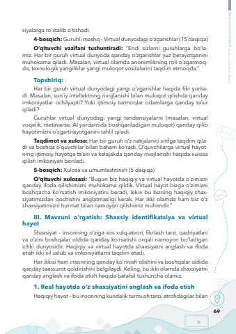 69MEDIASAVODXONLIK bo%u2018yicha metodik qo%u2018llanmasiyalarga to%u2018xtalib o%u2018tishadi.4-bosqich: Guruhli mashq %u2013 Virtual dunyodagi o%u2018zgarishlar (15 daqiqa)O%u2018qituvchi vazifani tushuntiradi: %u201cEndi sizlarni guruhlarga bo%u2018lamiz. Har bir guruh virtual dunyoda qanday o%u2018zgarishlar yuz berayotganini muhokama qiladi. Masalan, virtual olamda anonimlikning roli o%u2018zgarmoqda, texnologik yangiliklar yangi muloqot vositalarini taqdim etmoqda.%u201dTopshiriq:Har bir guruh virtual dunyodagi yangi o%u2018zgarishlar haqida fikr yuritadi. Masalan, sun%u2019iy intellektning rivojlanishi bilan muloqot qilishda qanday imkoniyatlar ochilyapti? Yoki ijtimoiy tarmoqlar odamlarga qanday ta%u2019sir qiladi?Guruhlar virtual dunyodagi yangi tendensiyalarni (masalan, virtual voqelik, metaverse, AI yordamida boshqariladigan muloqot) qanday qilib hayotimizni o%u2018zgartirayotganini tahlil qiladi.Taqdimot va xulosa: Har bir guruh o%u2018z natijalarini sinfga taqdim qiladi va boshqa o%u2018quvchilar bilan baham ko%u2018radi. O%u2018quvchilarga virtual hayotning ijtimoiy hayotga ta%u2019siri va kelajakda qanday rivojlanishi haqida xulosa qilish imkoniyati beriladi.5-bosqich: Xulosa va umumlashtirish (5 daqiqa)O%u2018qituvchi xulosasi: %u201cBugun biz haqiqiy va virtual hayotda o%u2018zimizni qanday ifoda qilishimizni muhokama qildik. Virtual hayot bizga o%u2018zimizni boshqacha ko%u2018rsatish imkoniyatini beradi, lekin bu bizning haqiqiy shaxsiyatimizdan qochishni anglatmasligi kerak. Har ikki olamda ham biz o%u2018z shaxsiyatimizni hurmat bilan namoyon qilishimiz muhimdir.%u201dIII. Mavzuni o%u2018rgatish: Shaxsiy identifikatsiya va virtual hayotShaxsiyat %u2013 insonning o%u2018ziga xos xulq-atvori, fikrlash tarzi, qadriyatlari va o%u2018zini boshqalar oldida qanday ko%u2018rsatishi orqali namoyon bo%u2018ladigan ichki dunyosidir. Haqiqiy va virtual hayotda shaxsiyatni anglash va ifoda etish ikki xil uslub va imkoniyatlarni taqdim etadi. Har ikkisi ham insonning qanday ko%u2018rinish olishini va boshqalar oldida qanday taassurot qoldirishini belgilaydi. Keling, bu ikki olamda shaxsiyatni qanday anglash va ifoda etish haqida batafsil tushuncha olamiz.1. Real hayotda o%u2018z shaxsiyatini anglash va ifoda etishHaqiqiy hayot %u2013 bu insonning kundalik turmush tarzi, atrofidagilar bilan