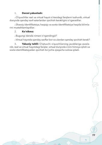 77MEDIASAVODXONLIK bo%u2018yicha metodik qo%u2018llanma1.Darsni yakunlash:oO%u2018quvchilar real va virtual hayot o%u2018rtasidagi farqlarni tushunib, virtual dunyoda qanday xavf-xatarlardan qochish kerakligini o%u2018rganadilar.oShaxsiy identifikatsiya, haqiqiy va soxta identifikatsiya haqida bilimlarini mustahkamlaydilar.2.Ko%u2018nikma:oBugungi darsda nimani o%u2018rgandingiz?oVirtual hayotda qanday xavflar bor va ulardan qanday qochish kerak?3.Yakuniy tahlil: O%u2018qituvchi o%u2018quvchilarning javoblariga asoslanib, real va virtual hayotdagi farqlar, virtual dunyoda o%u2018zini himoya qilish va soxta identifikatsiyadan qochish bo%u2018yicha qisqacha xulosa qiladi.