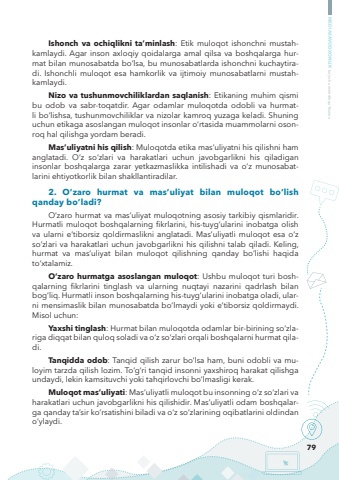 79MEDIASAVODXONLIK bo%u2018yicha metodik qo%u2018llanmaIshonch va ochiqlikni ta%u2019minlash: Etik muloqot ishonchni mustahkamlaydi. Agar inson axloqiy qoidalarga amal qilsa va boshqalarga hurmat bilan munosabatda bo%u2018lsa, bu munosabatlarda ishonchni kuchaytiradi. Ishonchli muloqot esa hamkorlik va ijtimoiy munosabatlarni mustahkamlaydi.Nizo va tushunmovchiliklardan saqlanish: Etikaning muhim qismi bu odob va sabr-toqatdir. Agar odamlar muloqotda odobli va hurmatli bo%u2018lishsa, tushunmovchiliklar va nizolar kamroq yuzaga keladi. Shuning uchun etikaga asoslangan muloqot insonlar o%u2018rtasida muammolarni osonroq hal qilishga yordam beradi.Mas%u2019uliyatni his qilish: Muloqotda etika mas%u2019uliyatni his qilishni ham anglatadi. O%u2018z so%u2018zlari va harakatlari uchun javobgarlikni his qiladigan insonlar boshqalarga zarar yetkazmaslikka intilishadi va o%u2018z munosabatlarini ehtiyotkorlik bilan shakllantiradilar.2. O%u2018zaro hurmat va mas%u2019uliyat bilan muloqot bo%u2018lish qanday bo%u2018ladi?O%u2018zaro hurmat va mas%u2019uliyat muloqotning asosiy tarkibiy qismlaridir. Hurmatli muloqot boshqalarning fikrlarini, his-tuyg%u2018ularini inobatga olish va ularni e%u2019tiborsiz qoldirmaslikni anglatadi. Mas%u2019uliyatli muloqot esa o%u2018z so%u2018zlari va harakatlari uchun javobgarlikni his qilishni talab qiladi. Keling, hurmat va mas%u2019uliyat bilan muloqot qilishning qanday bo%u2018lishi haqida to%u2018xtalamiz.O%u2018zaro hurmatga asoslangan muloqot: Ushbu muloqot turi boshqalarning fikrlarini tinglash va ularning nuqtayi nazarini qadrlash bilan bog%u2018liq. Hurmatli inson boshqalarning his-tuyg%u2018ularini inobatga oladi, ularni mensimaslik bilan munosabatda bo%u2018lmaydi yoki e%u2019tiborsiz qoldirmaydi. Misol uchun:Yaxshi tinglash: Hurmat bilan muloqotda odamlar bir-birining so%u2018zlariga diqqat bilan quloq soladi va o%u2018z so%u2018zlari orqali boshqalarni hurmat qiladi.Tanqidda odob: Tanqid qilish zarur bo%u2018lsa ham, buni odobli va muloyim tarzda qilish lozim. To%u2018g%u2018ri tanqid insonni yaxshiroq harakat qilishga undaydi, lekin kamsituvchi yoki tahqirlovchi bo%u2018lmasligi kerak.Muloqot mas%u2019uliyati: Mas%u2019uliyatli muloqot bu insonning o%u2018z so%u2018zlari va harakatlari uchun javobgarlikni his qilishidir. Mas%u2019uliyatli odam boshqalarga qanday ta%u2019sir ko%u2018rsatishini biladi va o%u2018z so%u2018zlarining oqibatlarini oldindan o%u2018ylaydi.