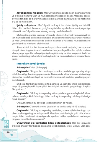80MEDIASAVODXONLIK bo%u2018yicha metodik qo%u2018llanmaJavobgarlikni his qilish: Mas%u2019uliyatli muloqotda inson boshqalarning va o%u2018zining his-tuyg%u2018ulari va munosabatlarini nazorat qiladi. Masalan, agressiv yoki tahdidli so%u2018zlar aytmasdan oldin ularning qanday ta%u2019sir ko%u2018rsatishini o%u2018ylab ko%u2018rish lozim.Ijobiy xulq-atvor: Mas%u2019uliyatli muloqot har doim ijobiy va halollik bilan olib boriladi. Masalan, yolg%u2018on aytishdan qochish va manipulyatsiya qilmaslik mas%u2019uliyatli muloqotning asosiy qoidalaridandir.Muloqotdagi etika insonlar o%u2018rtasida ishonch, hurmat va mas%u2019uliyat bilan munosabatda bo%u2018lish ko%u2018nikmasini shakllantirish uchun zarurdir. Hurmat va mas%u2019uliyat bilan muloqotda bo%u2018lish insonlar o%u2018rtasidagi munosabatlarni yaxshilaydi va nizolarni oldini oladi. Shu sababli har bir inson muloqotda hurmatni saqlashi, boshqalarni diqqat bilan tinglashi va o%u2018z so%u2018zlari uchun javobgarlikni his qilishi muhim ahamiyatga ega. Bu nafaqat jamiyatdagi ijtimoiy tartibni saqlaydi, balki insonlar o%u2018rtasidagi ishonchni kuchaytiradi va munosabatlarni mustahkamlaydi.Interaktiv savol-javob: 1-bosqich: Kirish (5 daqiqa)O%u2018qituvchi: %u201cBugun biz muloqotda etika qoidalariga qanday rioya qilish kerakligi haqida gaplashamiz. Muloqotda etika shaxslar o%u2018rtasidagi ishonchni mustahkamlaydi va hurmatli munosabat muhitini yaratishga yordam beradi. Endi o%u2018z tajribangiz bilan o%u2018rtoqlashasiz va qanday etika qoidalariga rioya qilganingiz yoki rioya qilish kerakligini tushunib yetganingiz haqida fikr yuritasiz.%u201dO%u2018qituvchi: %u201cMuloqotda qanday etika qoidalariga amal qilasiz? Misol uchun, sinfda yoki do%u2018stlaringiz bilan muloqotda qanday odob qoidalariga rioya qilasiz?%u201dO%u2018quvchilardan bu savolga javob berishlari so%u2018raladi.2-bosqich: O%u2018quvchilarning javoblari va tajribalari (10-15 daqiqa)O%u2018qituvchi: %u201cMuloqotda qanday qoidalarga amal qilishni o%u2018zingiz qachon tushunganingizni eslaysizmi? Masalan, do%u2018stlaringiz yoki oila a%u2019zolaringiz bilan muloqot qilayotganda qachon etika qoidalarini tushunganingizni misol keltira olasizmi?%u201dO%u2018quvchilar o%u2018z tajribalari bilan o%u2018rtoqlashadi: Har bir o%u2018quvchi o%u2018zining shaxsiy tajribasiga asoslanib javob beradi. Misol uchun, ular qan-